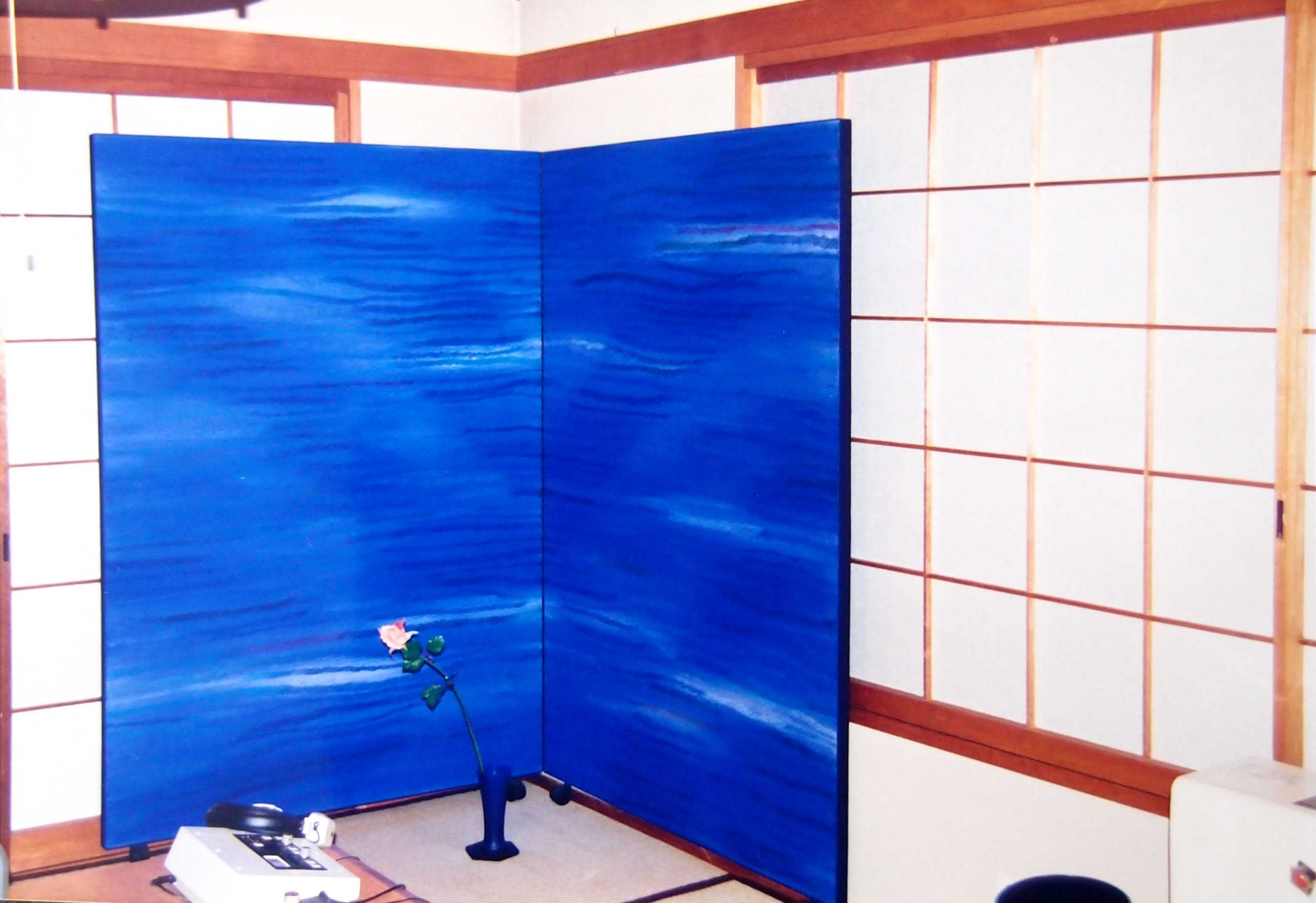 によって、絵を描かされています。私には、金色、紺色、藍色、青色が 脈打っている大屛風の前で、堀本惠美子さんが、能面をつけながら、日本の伝統芸能である能を舞っている姿が見えました。」 男性