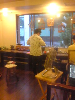 日曜日の夕方夕涼みがてら散歩に行った。今日は焼き肉が食べたい!!と私。夕食は外食にしようなんて言ってフラフラと街を歩くと「中国茶茶房」なる看板を発見メガネさん「入ってみようよ」私(気軽に)「いいよ~」と中へ入る。ワオ。チャイニーズ~♪ メニューを見ると…(2000円)←1人ワンオーダーげげ~高いっ!!メガネさん「どうする・・・・?」って言われても(--;)オーダーしました。私は【野生大紅袍】身体を温めるお茶 メガネさんは??忘れました目の前にあるポットで何杯でも飲むんですって。そしてクーラーはなく団扇を渡される目の前には中国パンダ奥の岩陰には仙人そして、出てきました。お茶が~ちゃんと?一番初めは注いでいただきましたお茶うけはドライマンゴー、ドライバナナ、ドライイチジクにドライ小豆です。汗をいっぱいかきながらお茶しました。そして、店を出て…今日は外食なし!とおいしいお肉100g800円を300g買って焼き肉をお家で行いました(^-^;)