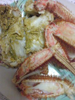 メガネさん(パートナー)が紋別の漁師さんから「毛ガニ」を頂いてきました。とっても大きい毛ガニです!!早速食べやすくさばいてもらいました。かに酢も作ってもらい、先にパクパク食べているとおお~さらに追加の皿がこの後、甲羅に味噌をたっぷりいれてお酒を注ぎ「蒸す」のだそうです彼が蟹を食べ始め…うーんやっぱり美味しそうだけど、妊婦には身体を冷やすからここまでです(涙)←パートナーの言葉でも…!蟹味噌をたっぷりつけて食べる様を見てはたまりませんキーキー怒る私を尻目にドンドン蟹を食べ続けるメガネさんでした・・・・く~っ!!!!(><)ふと、コトコト鍋の音が。「おっ、蒸しあがったな」そうです。あの味噌です。くやし~っ!!!!!!!熱燗作ってる。。。
