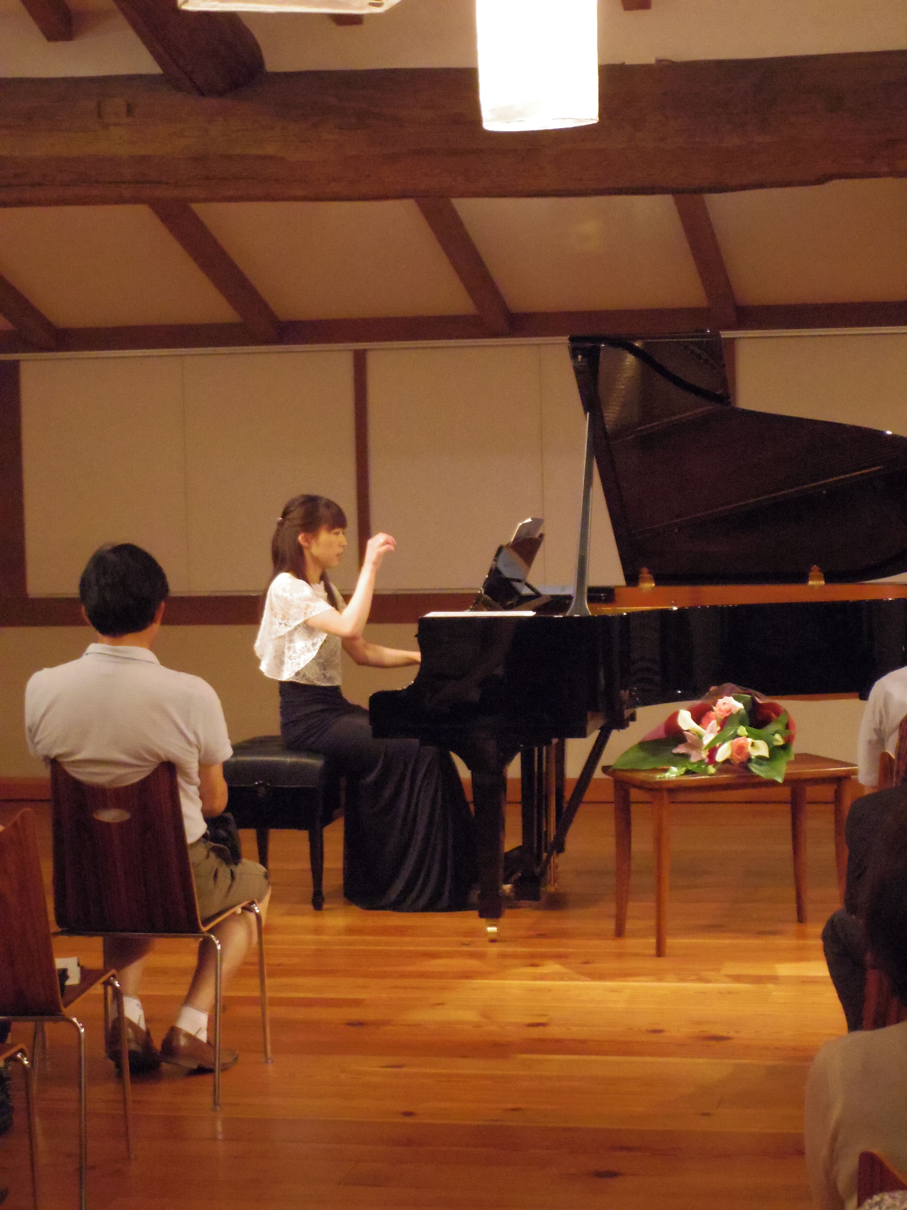 2010/08/05早起きできた。ちゃっちゃと身支度して名駅。予定してた8時の「しなの」に乗れた。朝食は松浦商店の幕の内弁当「こだま」この弁当はおれの理想の幕の内弁当。特に個性的なところはないのに最高にバランスがいいのだ。実に旨い。760円とゆー価格も立派。11時長野着。バスで大門竹風堂リハに立ち合って早紀ちゃんと軽く打ち合わせ。リハから高音の煌めきが素晴らしい。音楽の見通しも、和音の鳴りも31日よりスッキリして余裕がある。これは楽しみ。昼食、山野草のおにぎり一個14時から本番。暑い中ご来場いただきありがとうございました。高橋早紀子ちゃんは愛知県芸卒、名古屋在住、実家佐久とゆー悪条件だが不思議なことに彼女のコンサートはなぜかそこそこ集客がある(県芸は長野のピアノ業界ではアウトサイダー)。早紀ちゃんのチクルスは当日になってみると、あれ?意外と入ってるじゃん。って感じになる。ぷろ子のときもそうだったし、今回もそう。不思議なことだ。チクルスはプレイガイドのチケット全く動かず基本手売りのピアニストが多いけれど、早紀ちゃんはそんなに多くはないけどプレイガイドで動きがある。そして、早紀ちゃんも我々も把握してない人がフラッと聴きにくる。遠くから聴きに来て下さる方もいらっしゃる。もっといい条件のピアニストでも早紀ちゃんよりチクルスの集客さみしかった人もけっこう多い。いろいろ分析して今後の早紀ちゃんの集客アップにつなげていきたい。もっと長野で知られるべきミュージシャンだと思うので尚更。今日のプログラムは2つの詩曲Op63ソナタ6番Op62ソナタ7番「白ミサ」Op64山田耕筰「スクリャービンに捧ぐる曲」素晴らしい演奏。圧倒的。身贔屓ゼロで言ってます。7/31の演奏より落ち着いていて、見通しのいい演奏になった。6番のソナタなんかは7/31よりわかりやすく、ずっと短く感じた。トークも楽しくて興味深いモノになった。Op.63はおれが候補に挙げていて選んだのは早紀ちゃん。63-2はこの時期のスクリャービンの作品のキーになる曲なので、これを選んでくれてよかった。『羽のあるもので、女でも昆虫でもなく、つるっとしていて、でも女性的ですばしこく、色気があるけど、どうしても何かはわからない。』おれのレクチャーは非常にがっつりした内容でしたが皆様興味もってよく集中して聞いて下さって感謝してます。↑はトリスタン和声とか、神秘和音を例に挙げて調性の崩壊について説明してるところ。とても話しやすかった。感謝です。(お客さんが興味持って聞いてくれないと、非常に話しにくい。昔はそーゆーことも多かった)おれは長野のお客様の知性の高さを信じてるからレクチャーの内容を初心者にもわかりやすいように内容のレベルを落とすことは絶対しない。「わかりやすい」コンサートは世の中に溢れているので、そこはおれの担当じゃない。難しいことをわかりやすく説明することに興味はあるが、難しい内容は避けない。むしろ、敢えて難しい話をするようにしてる。長野はそれを求めてる知的好奇心旺盛なお客様が多くいらっしゃるからです。だからニーチェのことも詳細に語るし、セックスやエクスタシーと死との関係についても語るし、調性や伝統的和声の崩壊についても詳細に語る。これはあくまでも子供料金のない大人のための演奏会。子供がいても無視してセックスの話も堂々とする。スクリャービンでセックスやエクスタシーやニーチェの話は必須。避けられない話なのでちゃんと話す。そうそう、早紀ちゃんが選んでくれた山田耕筰の作品が素晴らしい演奏だった!これに心動かされた人も多かったようだ。早紀ちゃん、お疲れ様。彼女にはこれで2回チクルスを救ってもらった。(ぷろ子とスクリャービン)誰も引き受けてくれないキモになる大事な回を、引き受けてくれた。しかも彼女は必ず素晴らしい演奏で応えてくれる。ありがとう。終演後、早紀ちゃんの電車の時間まで二人だけで打ち上げ。ゆっくり話せてよかった。二人だけじゃないと話せないことも沢山あるので、よかった。