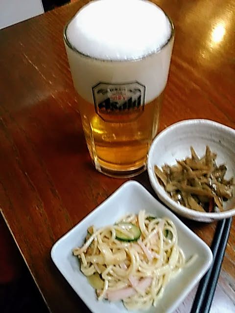 おれは晩酌セットA 生中1,日本酒一合小鉢二つと料理一品で1500円程度