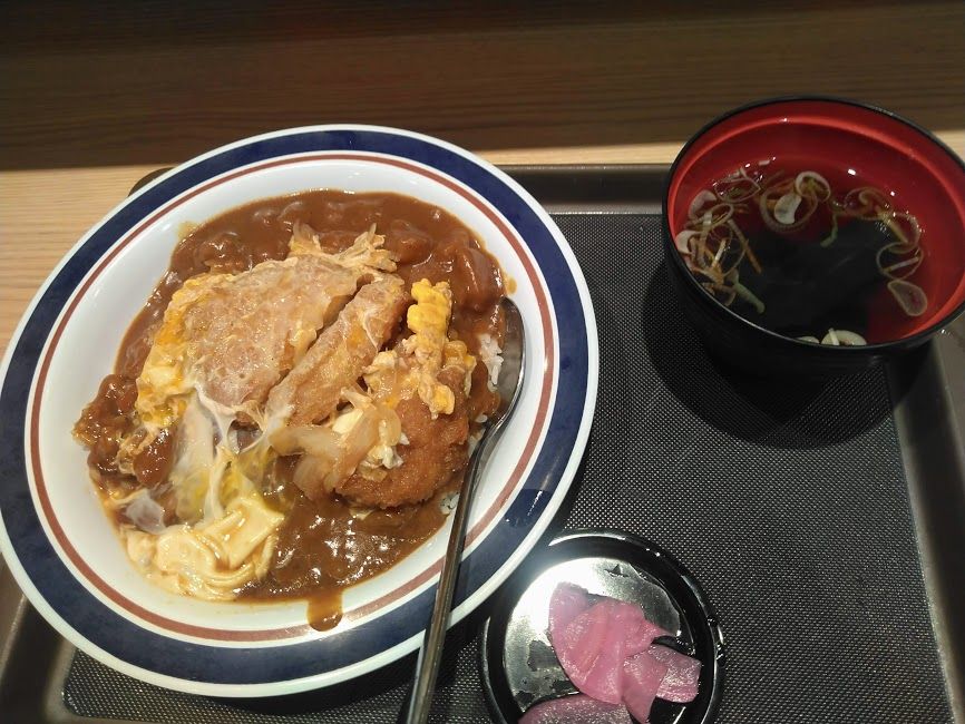 かつ丼のカツの卵とじがカレーライスに乗せてある。