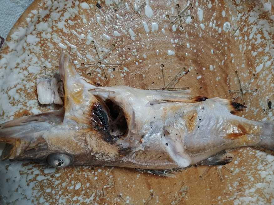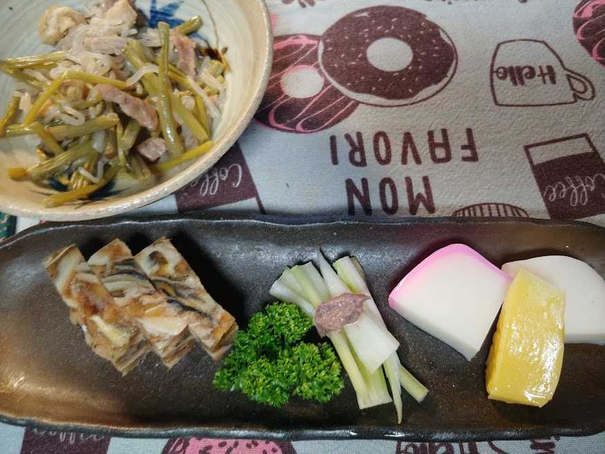 アラの塩焼き、穴子の煮こごり、かまぼこ、みずの煮物