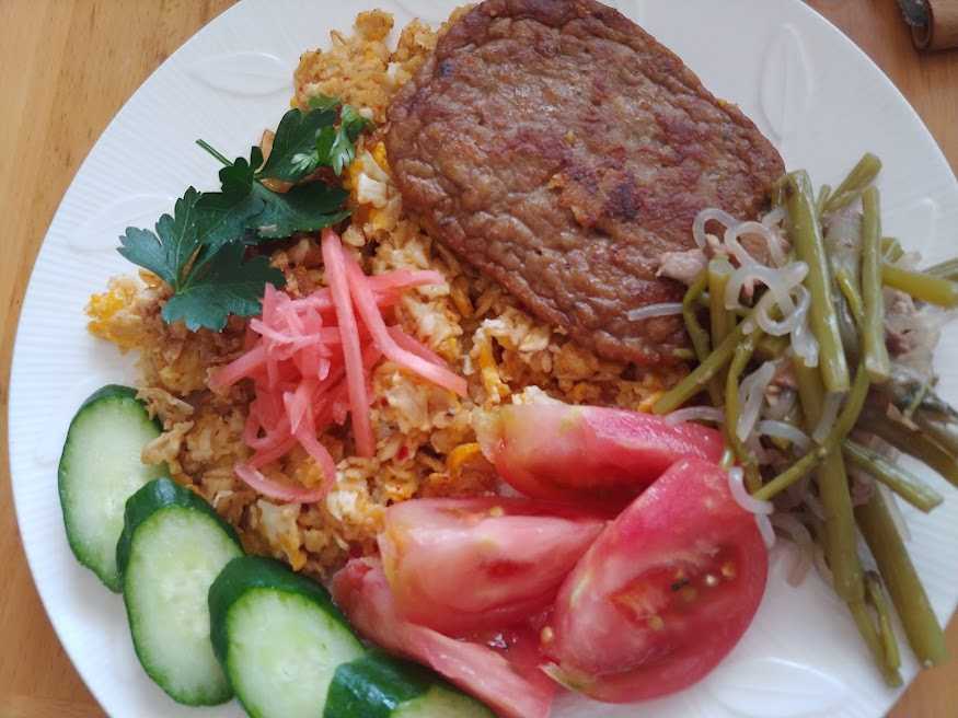昼、オートミールチャーハン、マルシンハンバーグスパイシー。