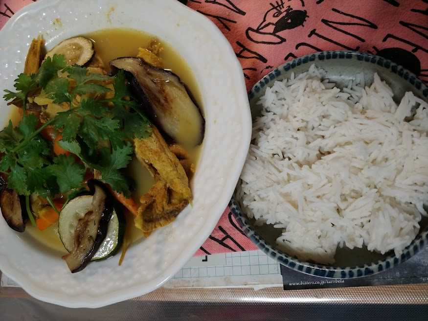 夕メシ、魚のアラのカレー。ターメリックで煮るだけのシンプルさだが、これはやっぱりカレーだと思う。