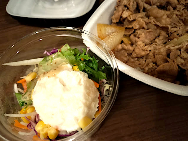 夕メシ吉野家牛丼とポテサラをテイクアウトして部屋でおとなしく食う。