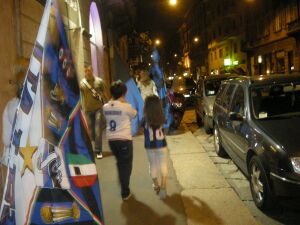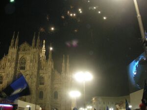 ハーはーハー、ミランは負けた!!今夜8時30分に、Udinese-Milan戦が、始まった。前半、ペナルティーゴールで、Udineseが先取。そして後半、またもやUdineseが二点目を取った後、最後にミランの意地で、アンブロジーニが、ゴールを決めたが、結局試合は、2-1でUdineseで勝ち。 試合が終ると、もはや22:20、インテルファンのファミリーと、近所で待ち合わせ、ミラノの中心ドーモ広場へ、向かう。インテリスタたちは、試合が終った事態で、ドーモに向かい始めた。 私たちは、近所で待ち合わせをして、Duomoに向かい始めた。我家から、Duomoまで歩いて行ける。この通りは、トリノ通り。歩って行く人、車で通る人たちは、私たちが、旗を持ってるのを見ると、クラクションを鳴らす。そうすると私たちは、こぶしを振って答える。 Duomoを背に、たくさんの人が集まり始める。Duomo広場に着くと、かなりの人がもう集まっていた。 昨日の夜から、インテルの旗を縫わされた。真ん中の白・赤・緑は、シーリーズ優勝の印。17回優勝。なかなかよくできたかなー