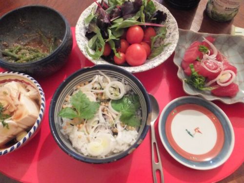27日土曜日 本日は、日本人学校が最終日。持ち寄りパーティーがあるので、朝からおにぎりの準備です。出来上がり。学校に持って行きます。 日本人学校の授業中、ママ友とカフェとおしゃべり、ただグループの中には、昨日一日中一緒に過ごしたママ友もいたので、二日連続に結構笑えました。 授業終わってからの持ち寄りパーティーに顔を出して、少し食べて、担任の先生に挨拶をして、帰りました。 夕飯は、持ち寄りパーティでいろいろと食べたので、軽くそうめんにしました。 28日日曜日 今週は毎日出ずっぱりで、かなり疲れた。一日中ゾンビでした。お昼は、やはり行き着くところは、お茶漬けと冷奴!! 夕飯は、写真はありませんが、スパゲッティ・ボッタルガとサラダ。 29日月曜日朝9時20分にミラノ万博に行くために、家を出た娘。友達と一緒に出かけました。朝、pcでブログをしたり、洗濯、掃除をして、スーパーにお使いに行きました。 夕方帰ってくると思ったら、一緒に行った友達の親が夜の部から入るという、そのため夜遅くまでいると言われ、子供たちで行動させて、帰ってくるほうが楽しいだろうに、なんでここまで親が介入するのかなー!!と思ってしまう私。 万博の夜の部では、生命の木のライティングが楽しめます。たくさんの人が集まります。 30日火曜日 朝からパートです。 パートの後、家もよりのスーパーでお使いをして、家に帰りました。 夕飯は、メロンに生ハムポテトサラダが食べたくなり、おいしかったです。