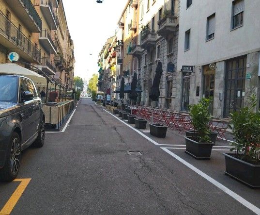 ロックダウン解除後、一か月したのちに、飲食店での飲食にイタリア政府からGoサインがでました。その後、空気の換気問題から、室内の飲食より、屋外での飲食を推奨し、普段は屋外での設置には、許可と使用代の税金などが生じるのですが、使用代などを取っ払っい、ただ今路上営業をあちらこちらで見ることが出来ます。特に、Via Voltaの飲食店は、皆路上に進出!このように、思いっきり路上に進出!車を駐車する場所が減るんだなー!と理解しましたが、この期間、街に残っている人も少ないので、駐車できる場所が減っても問題なしか!と思ったり、私のお気に入りレストランLa Vecchia Liraは、かなり思いっきり外に進出していました!特に、レストランは、お持ち帰り以外、営業は6月から許可が下りたので、稼ぎ時ですよねーーこのように、道端あちらこちらに、カフェも進出しています!Via Voltaから地下鉄駅Mocvovaに出て、地下鉄にて、Sant'agostinoまで乗り、Viale Papinianoに到着。Hiromi Cakeへ行く為だったのですが、いつも交通で賑わうPapinianoも、人はいなかった!でもHiromi Cakeは混んでました!
