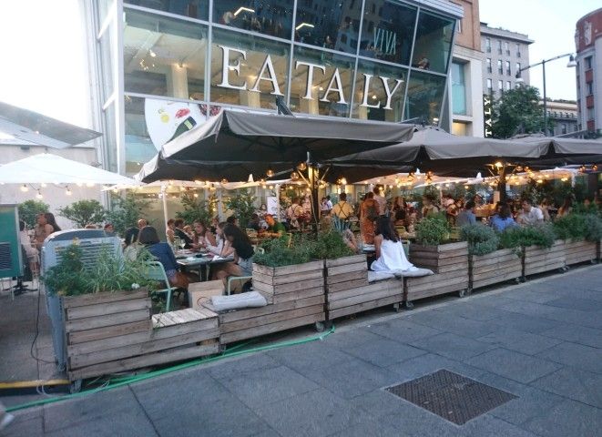 14日火曜日は、本当に長い日で、夜はアペにも行きました。12800歩は歩いていました!お姉さま友人が、この日はあいているとかで、アペに近所までいらして下さいました!私たちは、いつもプリンチに行っているのですが、この日は、反対側のEatlyでも同じ値段でアペルティーボをしているので、行って見ました。外側のスペースでは、混み混みで、席が空いてなく、店内でのアペになりました。一人分、イータリーでは、ハム類のmortadellaが付いていました。内容はあまり変わらないかなーー。でもプリンチのほうがいいかも?ですねーーーー今回のコロナウィルス感染防止のために取られた対策が、屋外設置、よって、PrinciとEatlyのある25Aprile広場には、たくさんのオープンスペースが設置され、賑わいを見せています。↑ここもEatlyなのですが、満員。設置の仕方もおしゃれ!バールが、外へ進出、この光景が楽しくなりますよね!!ロックダウン解除後、未だに普通の生活には戻れませんが、それはそれで、楽しみ方を見つけるイタリア人。素晴らしいですよね!そして、常におしゃれ心は忘れない!アペの後、Corso Comoから、Gae Aulenti広場のFeltrinelliのバールで、アメリカンコーヒーを飲み、おしゃべりは延々と続きました!