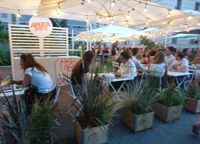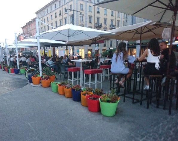 今回のコロナウィルス感染防止のために取られた対策が、屋外設置、よって、PrinciとEatlyのある25Aprile広場には、たくさんのオープンスペースが設置され、
