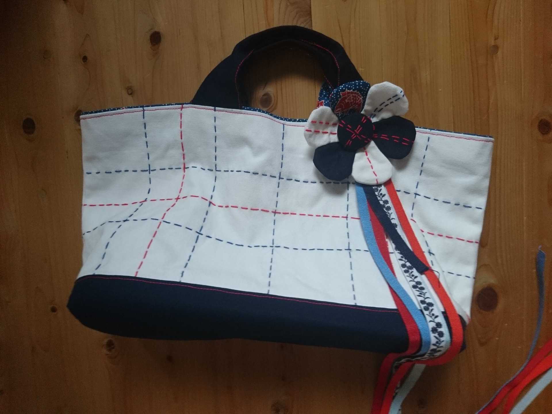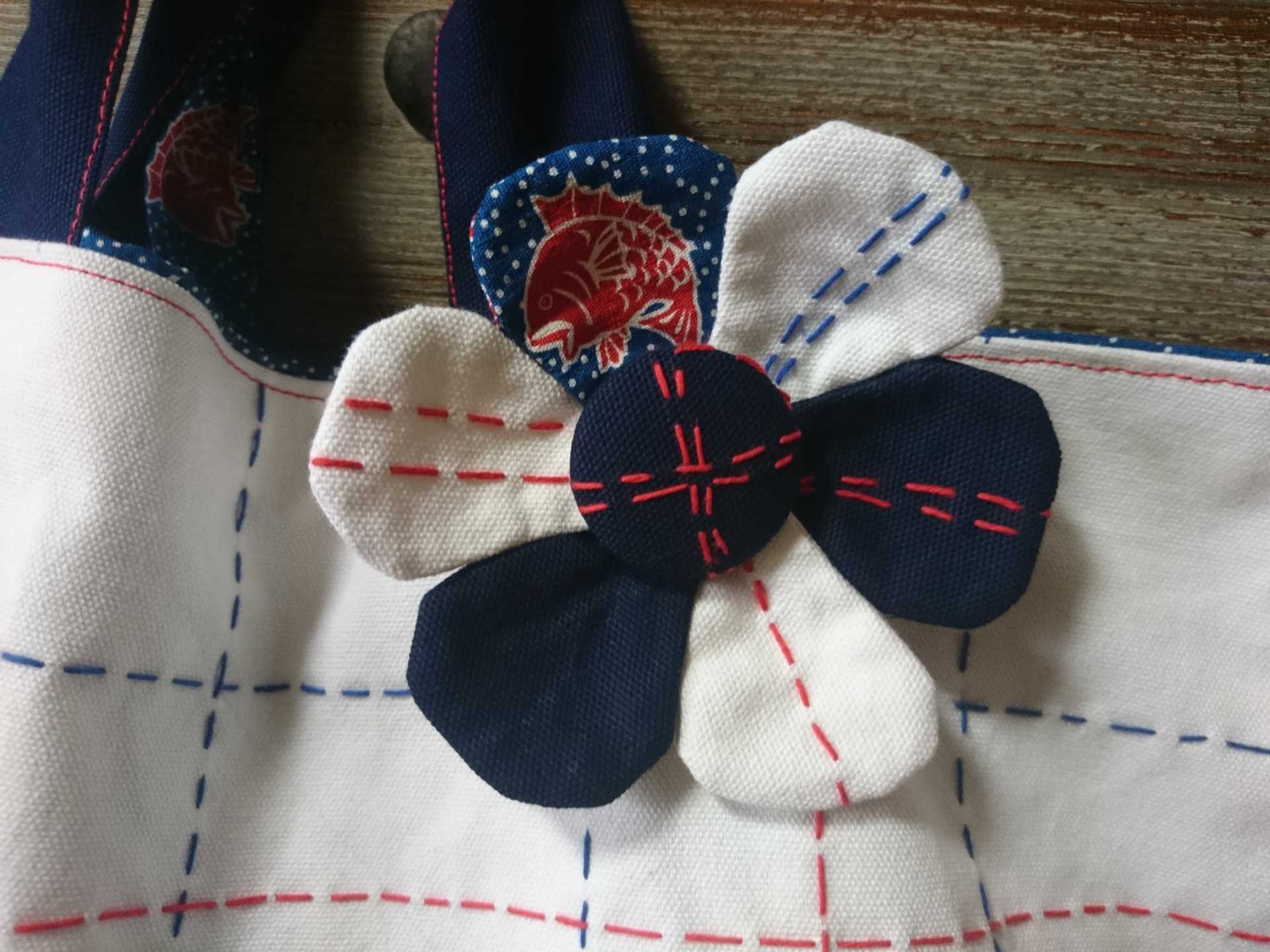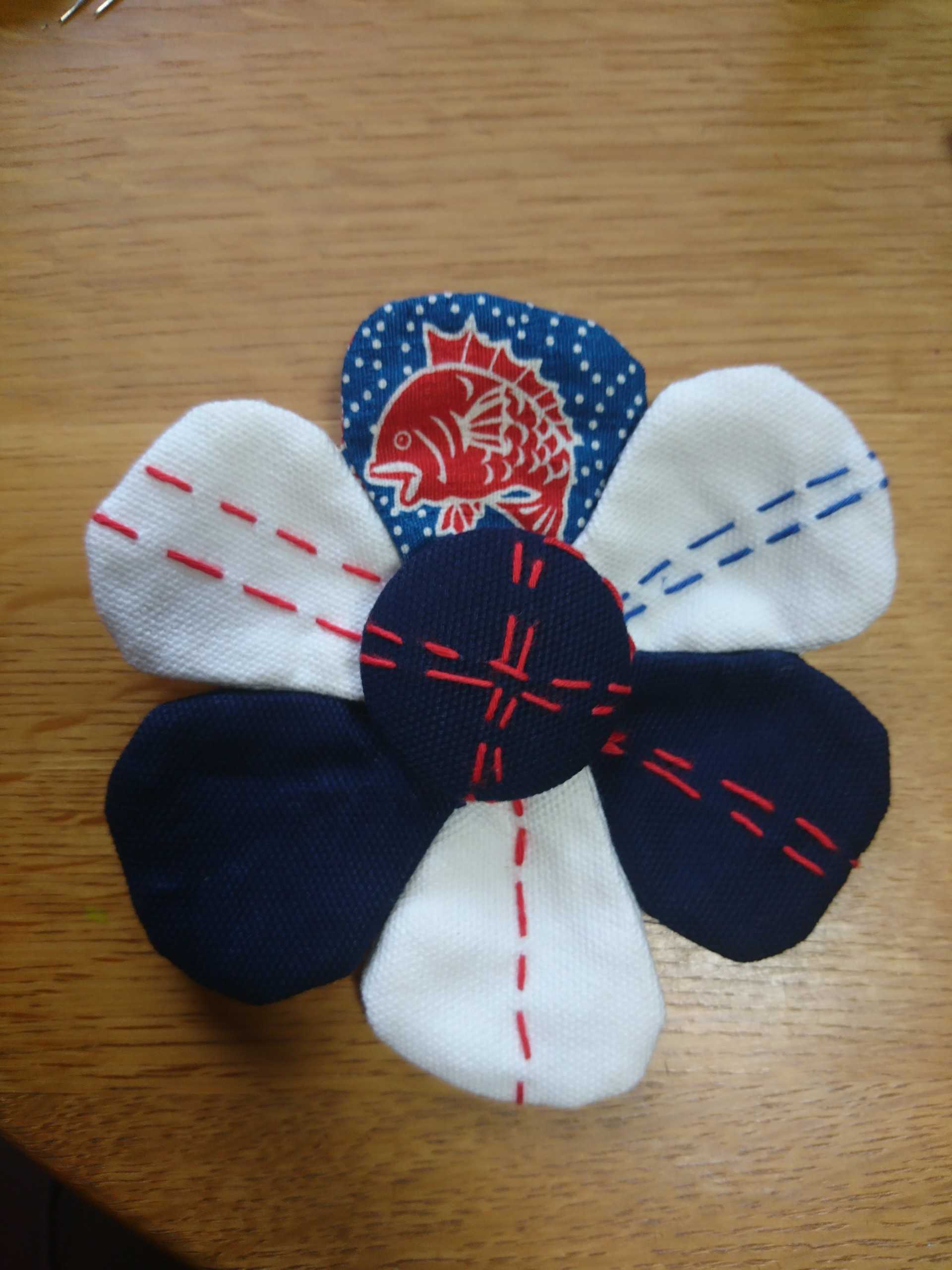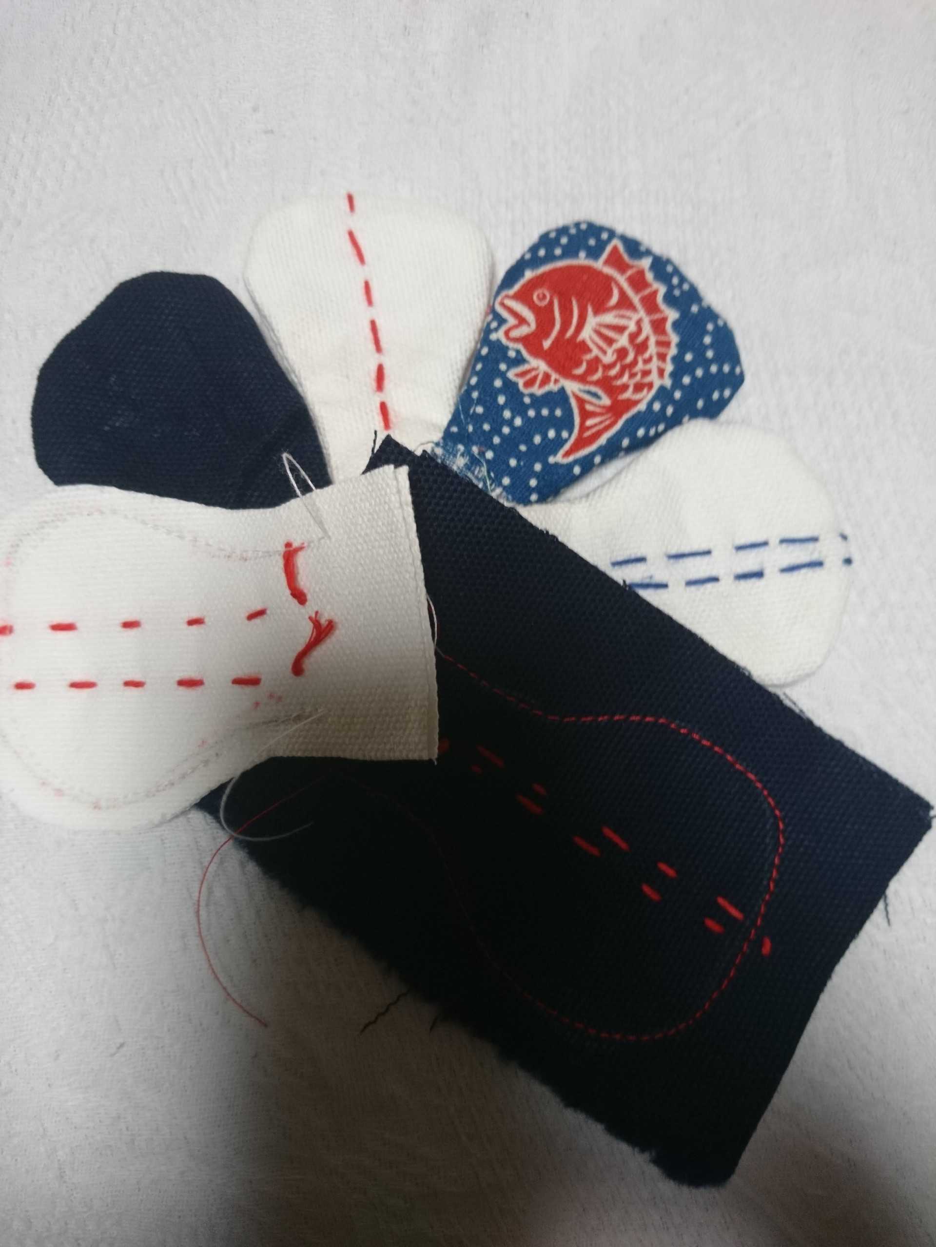 今回は、鯛ちゃん一押し、刺し子もしつつ、バッグと同じ帆布地を使って作りました❣️