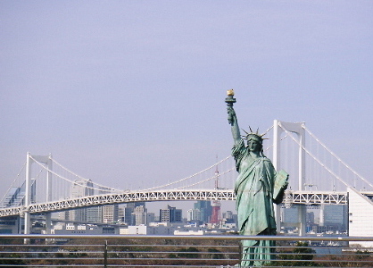 自由の女神!背景はゴールデンブリッジ?・・・レインボーブリッジです。遠くに東京タワーが・・・。今日、足を引きずってでも行かねばならなかったのが、ココ、無人運転銀河鉄道ならぬ、ゆりかもめで新橋から15分、台場駅隣の日航ホテル東京でした。(独)工業所有権情報・研修館による「特許ビジネス市:セミナー」と言うのがあって、どうしても参加せねばならなかったのです。朝早くからビッコで足をケンケンさせて来ました、昼はホテルのロビーの大きなソファーで休もう・・・と考えてたのに、昼飯も食わずに、東京湾お台場界隈の景色に圧倒、“怪しい探検隊”になってしまうのです。フジテレビの独特の建物が右側です。見学者が一杯(鈴なり)でした。あるある大辞典が中止になったのに・・・。それにしてもこの辺は凄い、いや、ひどい、海が全て埋め立てられ高層ビルが連立、船もクリスタルハーモー等の高級クルーズ船、誰が乗るの?心配後無用、予約は一杯らしい。竹芝桟橋から八丈島へ・・・。浜松町あたりからの遊覧船・屋形船(今の時期は、コタツに入り天婦羅を食べる・・・)もチラホラ見える。これも、連日、夕方から予約が一杯とのこと。(夏の花火の時期などの夕涼み・・・それならわかる・・・)船頭(船長)は、いなせな紺の股引半纏、捩りはじまきの若き女性、客もおばちゃん達もいるにはいるが、若き男女が圧倒的・・・。何かが違います、フリーターかどうかはわかりませんが豊かです。何故、平日にかくも余裕で遊んで?おれるのか?誰が平日に汗水たらして仕事などしているのか。何やら、自分は置いてきぼりになりつつあるのか、最早ついていけないのか・・・判らない。