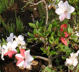 新聞に「紅白のツツジが咲いた」と、大きな写真が、梅などの「思いのまま:赤い花と白い花」と異なり5弁の花びらが、半分が赤で、半分が白でした。珍しいことではないと思っていました。だって、ほら!このツツジなんか、見て!わが町、人口約40万人で中核市に昇格しました話題は、田舎の町並です・・・・!今年の夏の有名な「花火大会」が中止と決定されました。その前に行う「○○祭り」はかろうじて行うらしい。協力金は約1400万円だそうな・・・・。(市長)花火は、不景気で企業商店などの協賛金が集まらないので中止なのだそうな(1900万円・・・)マラソンは参加費徴収、運営はボランティアで・・・。我が町内会、盆踊り、夏祭りやるぞー!でも花火は、危険だからやめて!って・・・・。