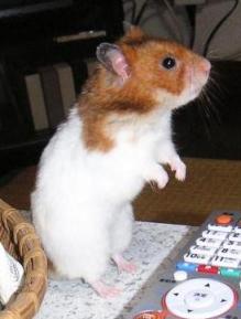 ハムスターは夜行性の動物のため、この新人リロ助はあまり外に出ません。(いつも寝ているので、出してあげられません・・・)今朝、寝る前に餌で釣られ出てきました。立って、何か言おうとしています。姉のタロ子は人間と同じで、人が起きているときは愛想を振りまき夜は人間と同じ時間に寝ます。どちらがいいかって? どちらでもいいと思います。