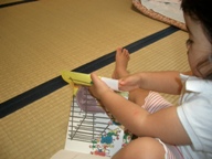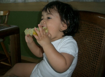 今日は七夕七夕を日本で過ごすのは8年振り。夫に七夕の意味を教えてあげたかったけどしどろもどろ。。。。実家の母が持ってきてくれた笹にたんざくを掛けようと、いざ、折り紙を探したが見当たらず。(たしか折り紙を使って色とりどりにするんですよね。)けっきょくそこら辺のレポート用紙を使って陽と一緒に作りました。 夫が帰ってきたらたんざくに願いを書いてもらって 家族全員の分がそろったところでまた写真を撮ることにしました。陽は手首がアトピーなのでかくのを防止するために ハンカチを巻いています。これが嫌がる、嫌がる。 *****************最近びっくりするのが、陽のこの座り方ベビーチェアの足をおくところにちょこっと座っています。 後ろ向きに落ちて後頭部をゴツンしないか心配。でも本人は色々な座り方、上り方をマスターして実に得意げなんですが、こっちはひやひや。いすを移動しても取り出してきては登る、登る。***************先日いただいたコーンを食べる陽の写真です。だいぶこつをつかんできました。前歯4本しか生えてないけど食べれるみたい。
