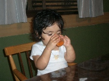いつのまにか一人でコップで飲み物を飲めるようになっていました。お風呂上りに野菜ジュースを飲む姿。相変わらず、たくましい娘です。にんじん色のおひげ付きです。そして1杯飲み干すごとにビールを飲んだあとのオヤジのごとく”あー”をご披露。これは間違いなく両親の真似でしょう。本当に親をよく観察しているものです。(怖)
