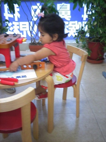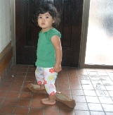 あまりの可愛さにGYMでLADYBUGが売り出されたとき迷わず買ってしまったクリッブシューズ。確かに可愛いのですが、自分でどしどし歩きたい陽にとっては不向きかも。日本は室内履きとかないし。でもささっとお買い物に行くときなんかは活用しています。パパの耳鼻科についていって処方箋を待っているときにパチリ。一丁前に椅子にすわっています。
