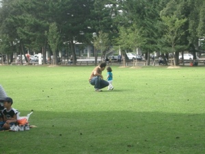 先日ママと二人でなら公園でのピクニックを楽しんだ話をパパにすると自分も行きたい!と言い出したので試験勉強の息抜きをかねて、今日も奈良公園へ元気に走り回ってその後3時間もお昼寝してしまいました。(父も母も添い寝しました。元気回復)元気に外遊びすると、刺激が大きすぎるのか夜泣きをしたり、寝かしつけのときに抱っこをせがんだりしかも抱っこ1時間とかになるとママの丈夫な腰も痛む、痛む。。。。やはり体重11キロは重かった。でも今日は疲労回復のお昼寝のおかげで思い存分抱っこをして寝かしつけました。そのときの安心した顔といったら。。。ママが疲れているときはそんな可愛い安心しきった顔を楽しむ余裕もないから。******最近のボキャブラリーみて、みて(最初はスペイン語のMIRA MIRAをMIR MIRと言っていたっけ)HOLA (スペイン語のHI)たべるお歌も段々リズミカルに、そして音程は違うけど歌っぽく音を出せるようになりました。お気に入りはアイアイとブンブンブン