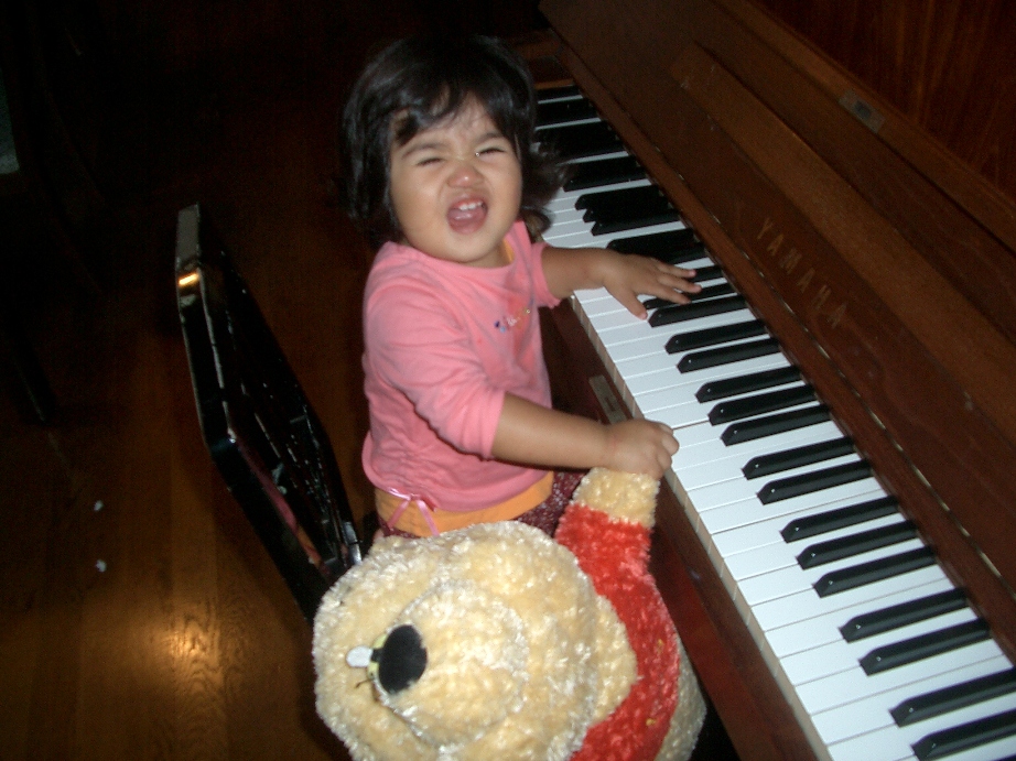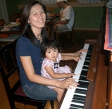 昨日はメキシコで知り合ってかれこれ5年ぐらいのお友達が遊びに来てくれました。陽はきれいなお姉さんのひざでピアノを一緒にひいてもらえてご機嫌、ご機嫌。ピアノからなかなか離れませんでした。ピアノにさわりたてのころには、片方の手だけで触っていたのにいつのまにか両手で指を動かしてひいています。とは言っても片方で2本が精一杯ですが。。。可愛い。うしろで必死に感じの勉強をしているのは、パパ。自称、ラーメン屋(温泉タオルでターバンにしてます。汗用)