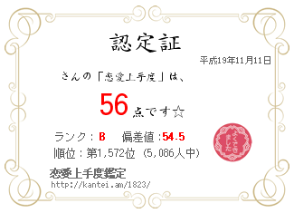 こんにちわみかんですすっかり秋ですねというか・・・ク リ ス マ スまであと、1ヶ月とちょっと皆様 今月11月は 出逢い強化月間 だそうですクリスマス直前に知り合っても、特別な日を二人で過ごすほど、急速に距離を縮めるのは難しい理想は、11月末までに知り合い、デートを重ねて12月18日くらいまでにクリスマスの約束をするという流れ勉強になりますクリスマスシーズンになると、あちこちカップルがいっぱいでほんっと羨ましいキレイなイルミネーションとかすてきな恋人と見に行きたいしおしゃれなレストランで食事をしたり手をつないでデートをしたぁぁぁいですよねそこで見つけた恋愛上手度鑑定 をやってみましたぁぁちなみにみかんは 56点ランク:B(A~E) 偏差値:54.5 順位:1572位(5086人中)鑑定証いただきましたご縁はそこそこ多く、異性の友達にも恵まれて楽しい交友関係を築けるものの、友達以上、恋人未満…というじれったい状況に陥りがち。状況の打開には積極的な行動も大切ですし、時には積極的にカマかけてみる、っていうことも必要です。 はぁーい。 がんばります。ラブラブクリスマスは自分次第って事でしょうか出逢い強化月間またにはいつもの自分より 少し積極的になってみるのもイイかもクリスマスまであと少し・・・ ★e-お見合い★ で素敵な方と出逢いましょう ★★★ 是非クリックしてくださいね ★★★