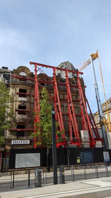ヨーロッパの街の建築は大概石造りで数百年経た今も当時の威厳を残していてその町並みはとても美しい。石造りだから長持ち、というのは一理あるけれど大変な努力をして今日まで引き継がれてきているものなのだということを改めて想いながら街を歩いていると添付の写真の改装作業に出くわした。交通量の多い近代都市なら外壁の洗浄は終わりのない仕事だ。割と柔らかい(たしか)砂岩で彫刻が施された窓枠なども風雨にさらされて原型が崩れてしまっていることも多い。こんな彫刻またやり直してくれる職人が今日でもいるのだろうか。昔の建物は今の建物と比較して天井が高いので同じ階数の建物なら高さがある。でも法定の高さ制限ぎりぎりに階数を増やすためだったのだろうけど、昔からある建物の上に味気ない建て増しをしている建物も割とあって醜いことこの上ない。写真の改装はファサードを残しながら中の改装を行っている作業で、ここの場合その他の骨組みも残しながら補強を施して改装していくようだ。でも時々ファサード”だけ”板の様に残して建物自体は全て解体して一から立て直していることもあって初めて見た時には本当に驚いた。何トンあるのか分からないファサードを倒れないように支えている図は何度見ても圧倒される。何とか過去から引き継がれてきた美を次の世代へ引き継いでいこうとする意志を感じる。全て取り崩して新しく建てる方が作業コストも時間も少ないはずなのだ・・・。日本でも古民家なんかを若い世代が改装して生活されていたりするのを聞くと嬉しくなる。一度失われたらもう元に戻せない。たくさんの人に大事に使われてきた古いものは愛おしい。