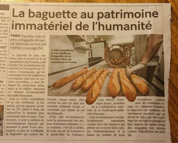 いやぁ~、スペイン戦!!興奮しましたねー☆グループ戦トップで通過、素晴らしい♡我が家は並行して行われていたドイツvsコスタリカ戦を観戦していたけど私は日本戦を電話で常にチェックしていた。ドイツはいまいち勢いに乗れずけっこう危ないミスもあったりで嫌な予感でいっぱいの一戦だった。日本が先制された時も嫌な予感が頭をよぎったけど同点に追いついた時にはいい予感がしてきた。今回はサプライズの多いワールドカップなのだ。ドイツは2大会続けてグループ戦敗退で長年の功労者(?)ミュラーが代表を辞めると発表し今はフリックの進退が問われている。長期に渡ってドイツ代表の劣化が批判されていた前監督ヨギの跡を継いで一年もたっていないのだからフリックが辞める必要はないと思うけど…。今でも政治論議かと思う様なサッカー議論が渦巻いているドイツ…。日本は毎大会ごとに一歩一歩高みへと昇っている感があって感動する。今回は強豪ドイツとスペインに勝利してキラキラ輝いている。さらなる未知のステージ、ベスト8進出へ向けてがんばれー!!!と大興奮の翌日はフランス語のレッスンの日だった。もともと女性がほとんどのクラスなのもあるかもしれないけどサッカーを観ている人はほとんどいないようでワールドカップの話をするのは私くらい。グループ戦を快勝して通過したフランスを喜ぶ一言もなく先生が第一声、「バゲットがユネスコ無形文化遺産に登録されたのよー!!!」確かにその日の新聞にも大きな記事が載っていた…。関係者には喜ばしいことかもしれないけれどこの選考に使われた予算がもっと生活がひっ迫している人々に届くような仕組みがあるといいのに、と世の中の曲がった構造を斜めな視線から思ってしまった。でも記事によると、バゲット製造に必要なものは小麦粉、水、塩、酵母と職人の勘とのこと。この肝心の職人が地方の小さな自治体で激減している。大量生産販売の食品流通の荒波をもろに食らっているらしく、このニュースですこしでも伝統的な本当に美味しいバゲット(日本人にとってのコメに当たる)への関心が高まるといい。フランス語学習者の方へバゲット単語集:la croûte :外側の殻状の部分croustillant :カリカリla mie :内側の白い部分(パンの”み”はここに語源があるってことないですか??)tendre, moelleux :ふわっと柔らかいdoré :黄金色(フランスパンは茶色ではないんです!)le quignon :フランスパンの両端の固いところ(一番おいしい♡)du levain :フランスパン製造に使われる自然酵母