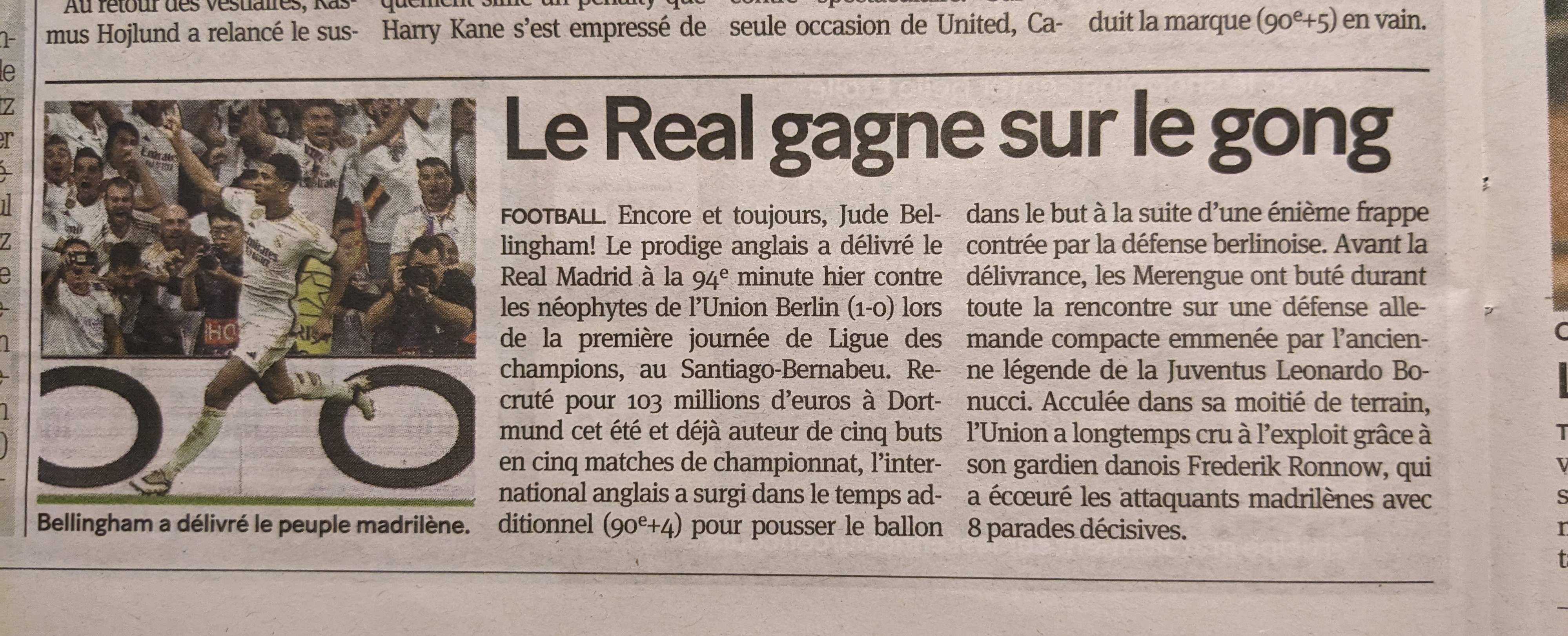 昨シーズンの活躍で今季は初チャンピオンズリーグ参戦のウニオン・ベルリン。ちょっと古いニュースですが先週レアルマドリードと対戦した。何とか試合が当地でも見れないものかと熱望したものの新参者だからか、だからこそルーキーとして話題になったりしないかと思ったけど、最近お坊ちゃんに教えてもらってインストールしたアプリで観戦(読むだけ…)した。強豪相手に最後まで0-0で手に汗握っていたのに、最後にドカンと決められてしまった。かなり押されていた試合だったのでFredy(デンマーク出身のキーパー)の活躍がなければもっと大差で負けていた試合ではあったのだ。でも同じ日にManUに勝利したバヤンミュンヘンのニュースが紙面を大きく占めてその下に、”Bllinghamが新人相手にゴールを決めた”みたいに書かれていて腹立たしい。新人なのに古株相手に94分無ゴールで戦った視点からも何か書いてくれよ~
