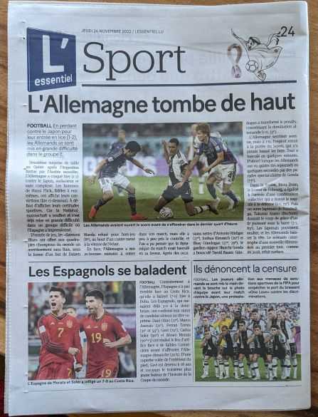 いやぁ~、先週の対ドイツ戦!後半勢いづいて手に汗握りましたねー☆でも昨日の対コスタリカ戦はもどかしいの一言で終始あ~、お~と頭を抱えながらの観戦だった…。対ドイツ戦はドイツ人の夫が在宅ワークで後半戦すぐ隣の部屋で仕事してるのはわかっていたけどつい大きな声が出てしまい、ドイツが負けたのもあるのだろうけど仕事の邪魔だったと試合後随分不機嫌に言われた。お坊ちゃんは学校だったけどサッカー少年たちと電話で戦況をチェックしていたらしい。ドイツ語の授業中だったらしいけど先生は寛大に大目に見てくれていたのか来月の成績表に現れてくるのか微妙なところだ…。ドイツメディアとSNSでは代表と監督のフリックの戦いぶりへの辛らつな批判で溢れ、さらに4年前の悪夢(ドイツサッカー史上初のグループ戦敗退)再びかの調子で悲壮感が漂っていた。それが批判と背水の陣的プレッシャーに強いのか夕べの(当地では夜8時キックオフ)対スペイン戦は、調子のいいスペイン相手に健闘していたと思う。(独走態勢だったサネがもっと手前で蹴り込んでいたら、とまだ悔しいけど)夕べは我が家の最初のアドベント(クリスマスまでの日曜日をカウントダウンしていく)をお坊ちゃんのサッカー友だちファミリーをお招きして晩餐し、そのままサッカー観戦した。というのもご主人がスペイン人…。せっかく仲良くなれたのに試合運び次第では不和になる可能性もあったけど、ものすごく楽しかった☆☆☆あっけなく勝負がついていつものメンツが勝ち進んでいくよりもサプライズがあった方が面白い。だから、ブルー侍、ニッポン!!スペインを打ち負かせ~!!先週の新聞:”ドイツ高みから転落”の記事