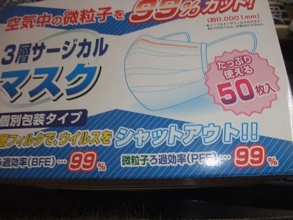 午後から、家にあるマスクを点検してみた。 2、3年前にコンビニで買ったものから、十数年前に職場で共同購入した物まで出てきた。 恐らく、サーズが流行った頃だったと思う。 下の写真が、それだ。 裏を見ると、正しいマスクの付け方が図入りで書いてある。 最近、テレビのニュースで見かけるマスク姿の人達は、顎まで覆うようにして付けているが、それが正しい付け方だ。 襞になっている部分を全部広げて、顎をすっぽりと入れるようにする。