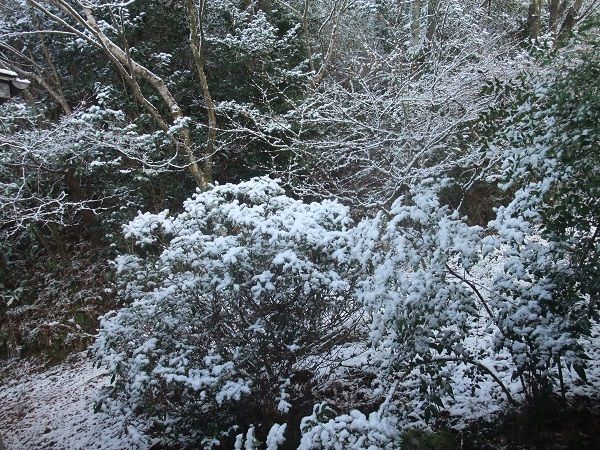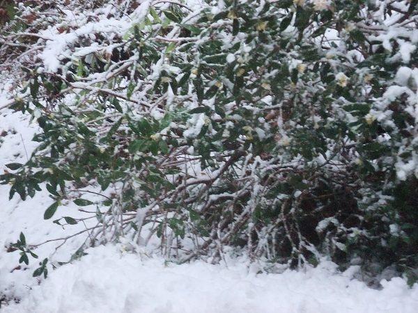 昨夜から降ったり止んだりしていた雨は、今朝起きてみると雪になっていた。 前回は薄らと積もっただけだったが、今朝のものは春の雪で湿気を多く含んでいたため、屋根に積もっても直ぐに落ちて雪の山脈を築いていた。 昨日撮した沈丁花も、雪に覆われた。 庭の木々も雪化粧だ。