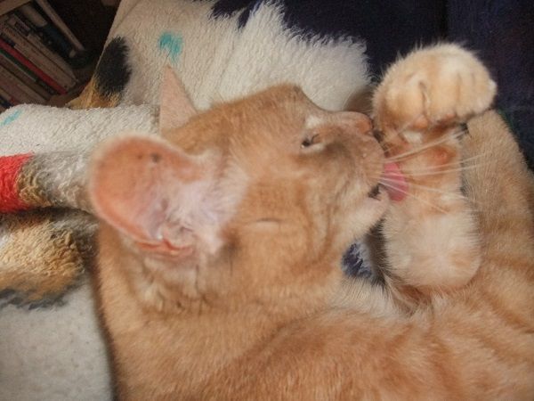 猫が、香箱座りをしていたので、カメラを持って寄っていくと…。 左の前足を出してきた! 猫パンチをくらうのかと思いきや、舐め舐め攻撃だった。