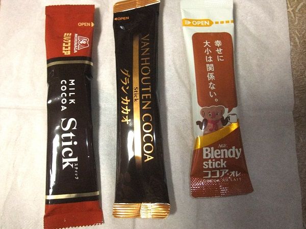 スティックタイプのコーヒーに加えて、ココアも好きで一日に一度は飲む。 ココアもコーヒーと同じく、スティックタイプを買っている。 昔飲んでいたココアは、先ずパウダー状のものをカップに入れ、それに少量のお湯を注ぎ、よく練ってから、またお湯を注ぐという面倒なものだった。 最初に買ったスティックココアは、AGFのものだったが、ココアの味はするが心を揺さ振るようなものではなかった。 しかし、真ん中のバンホーテンを口にした時は、『これだ!』と思った。 その香りといい味の深みといい、昔飲んでいたものと同じだった。 向かって左端の森永のスティックココアも、なかなかの味だった。 ミルクが入ったものやココアバターの比率でも、味が変わってくる。 向かって右端のAGFのものは、ココアバターの比率が他の2つのものの約半分しかないが、その分、癖がなくて飲みやすい。 味には、それぞれ好き好きがあるので、どれが美味しいとはいえない。 いずれにせよ、スティックの中に砂糖などが一緒に入っているので、作るのが簡単だ。