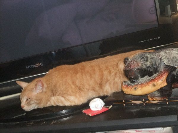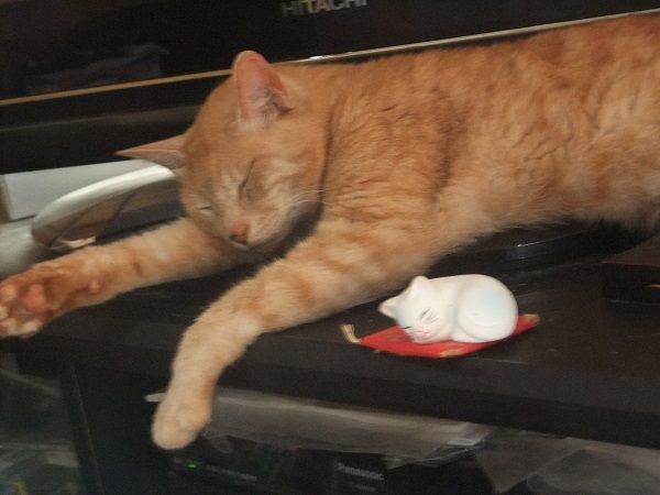 写真に撮ったときは、腕を伸ばしてしまっているが、その前は置物の猫と同じく、腕を畳んで、その上に頭を乗せて寝ていた。 猫は、この場所が好きとみえる。