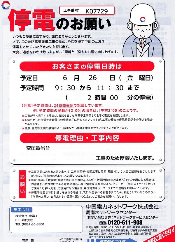 明日、午前9時半から11時半までの2時間、我が家のある一帯は『作業停電』になる。 月曜日の夕刻、郵便受けに以下のような『停電のお願い』が入っていた。 午前中の2時間だし、まだ6月の終わりなので、エアコンが使えなくても、さして困ることはない。 これが7月の半ば以降なら、午前中でも暑くて堪らない日があるが。 電柱に上って作業をする人のことを思えば、エアコンが使えない事など小さなことだ。 私は料理をしないから、冷蔵庫の中に傷む物は入れていないし、冷凍庫の中も『お握り』と『食パン』があるくらいだ。 この時期は、冷凍庫の中にアイスクリームを入れている人も多いことだろう。 ネットで調べてみると、冷蔵庫のドアの開閉を極力しないようにすれば、2時間程度の停電なら大丈夫だそうだ。