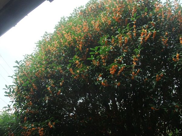 玄関先のキンモクセイ(金木犀)が満開になり、周囲に甘い香りを漂わせている。 このキンモクセイが咲くと、もう10月だと気づかされる。