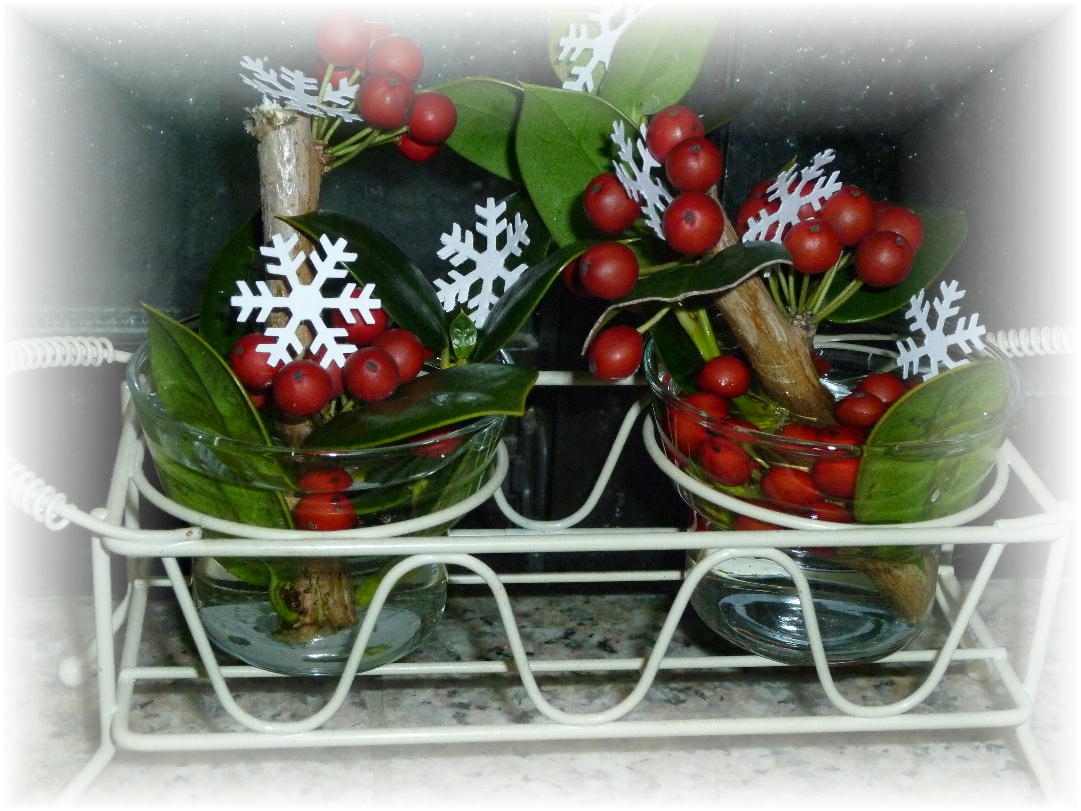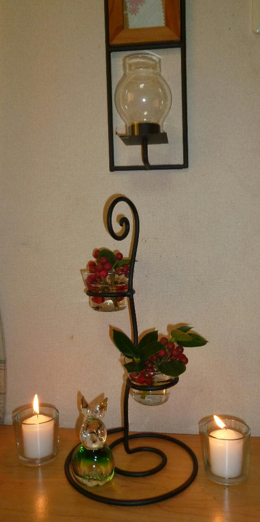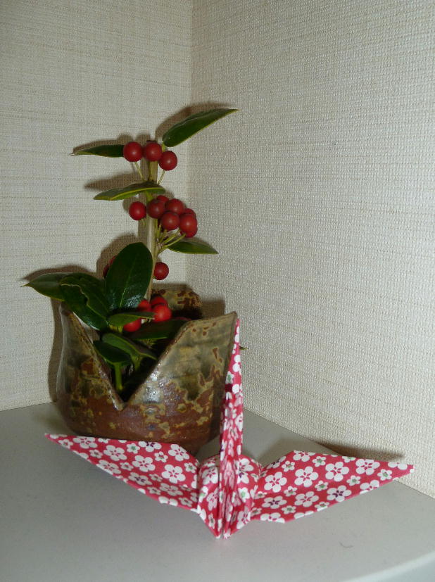 洗面スペースにも。ここは千代紙で折った折り鶴で。この赤い実はなんでしょう^^;某所に大きな木がありましていただいてきました。多分チャイニーズ・ホーリーの一種ではないかと思っているのですが定かではありません。すんごく大きくなった木が何本もあるので心やすくいただいています^^