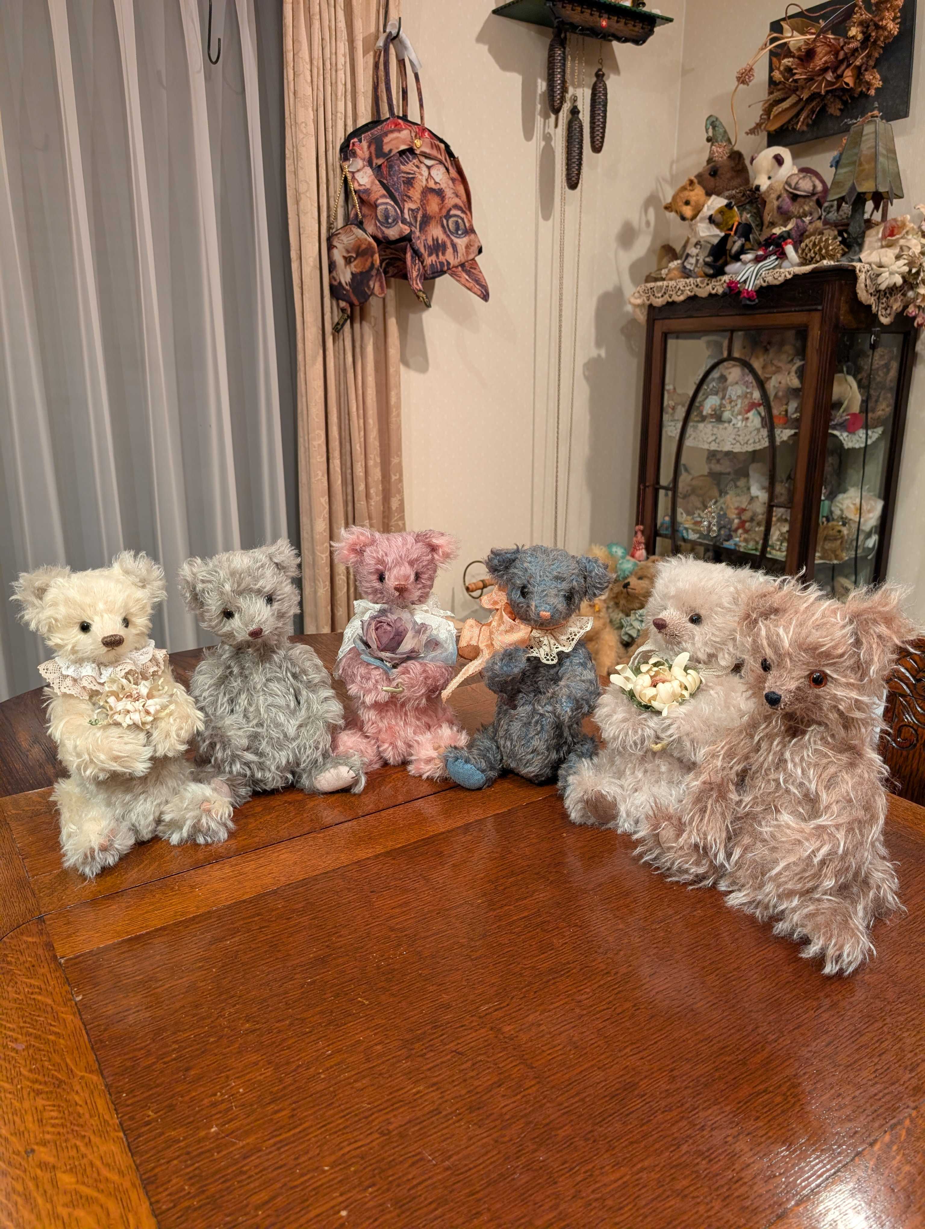 この子達は私の自宅生徒さん達の作品。1つの北尾オリジナル型紙で4名が6体作ったベア達。同じ型紙でも、それぞれが選ぶモヘアやガラスアイ、装飾品などが異なり、作り手が違うところに個性でてとても良い気がします。この生徒さん達の作品は非売品(参考作品)として会場に展示してみたい。