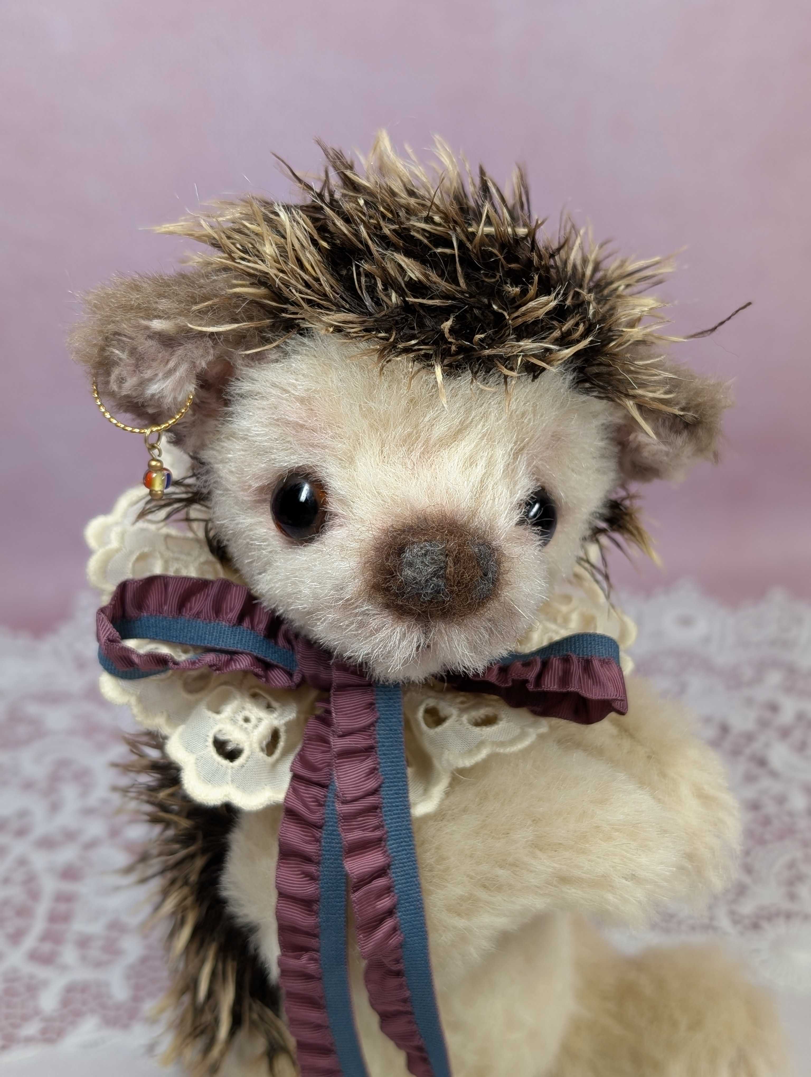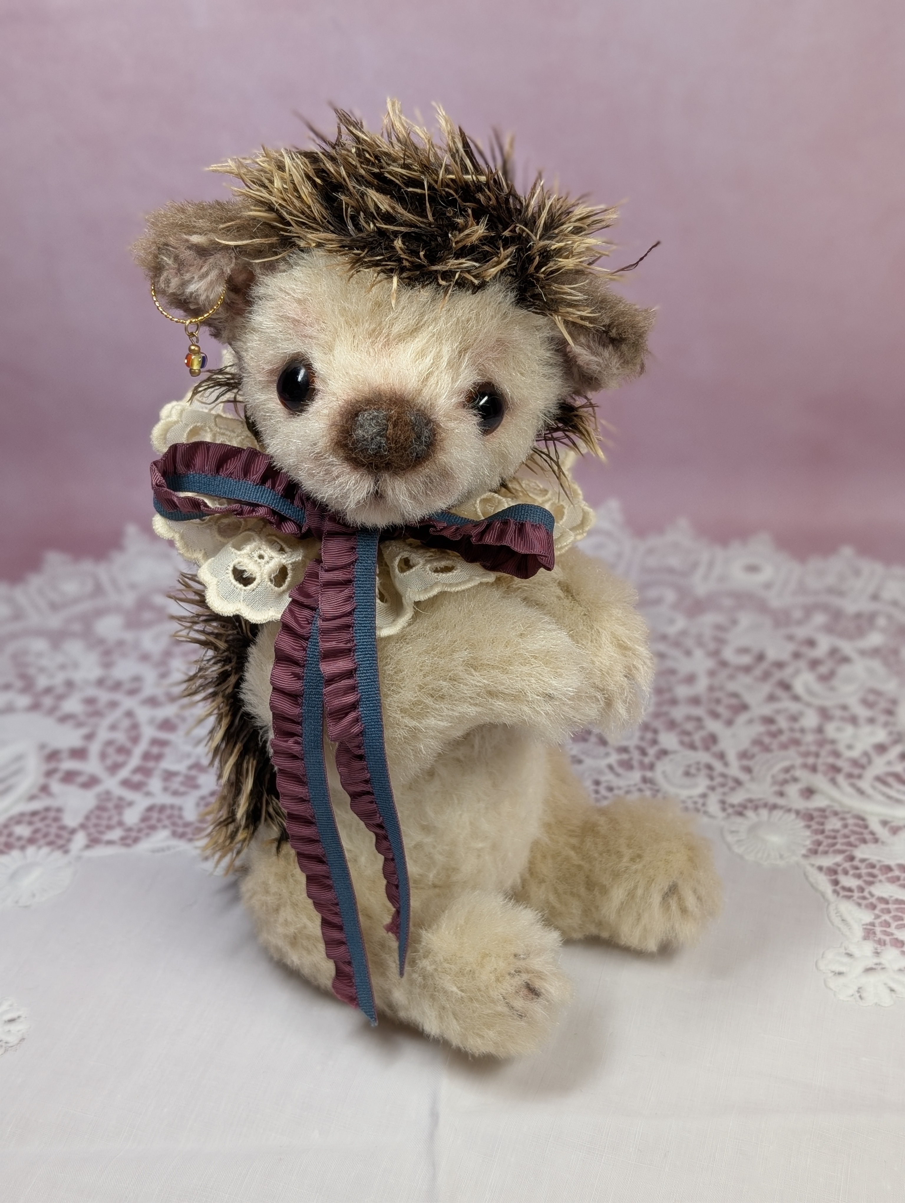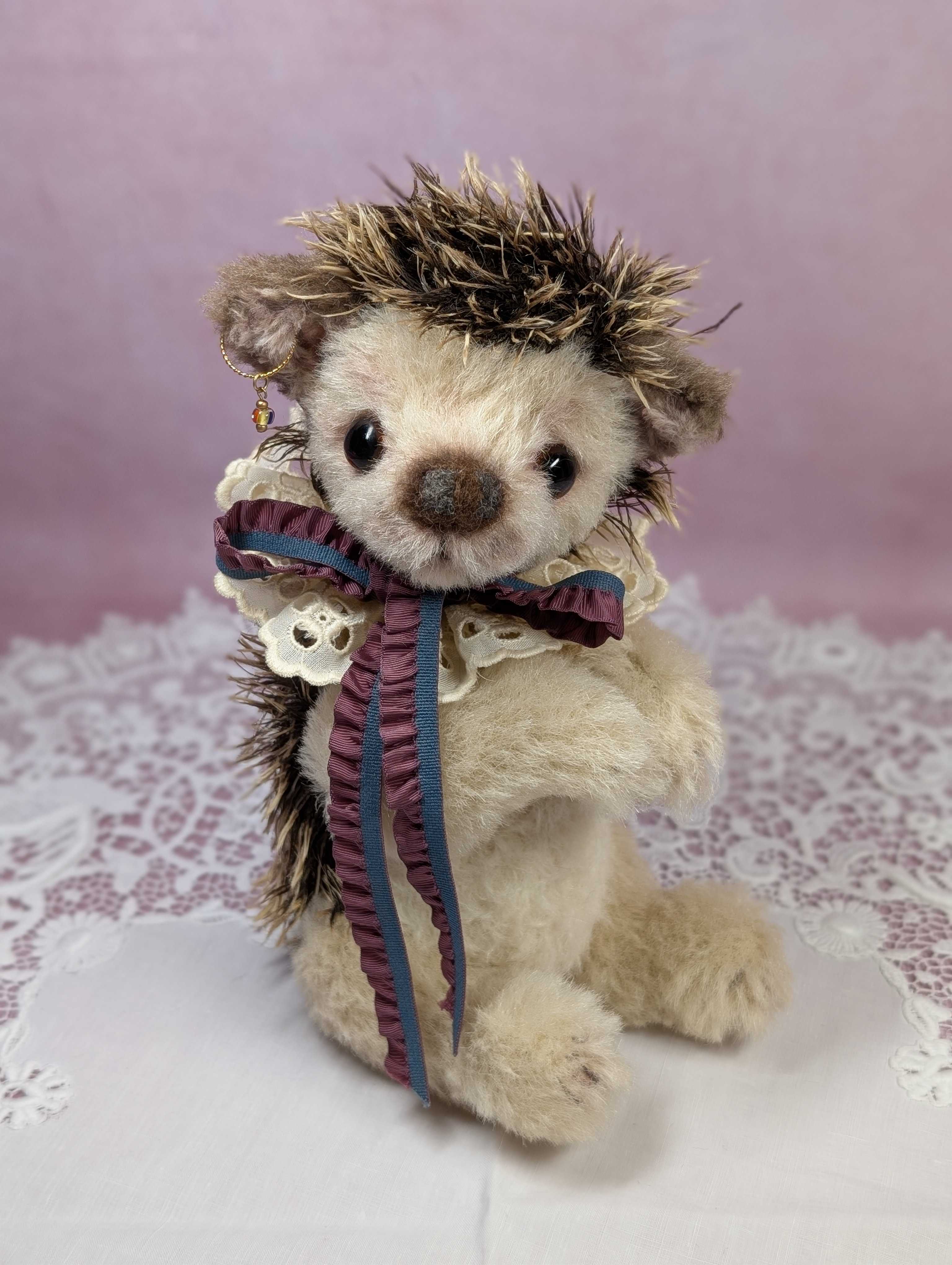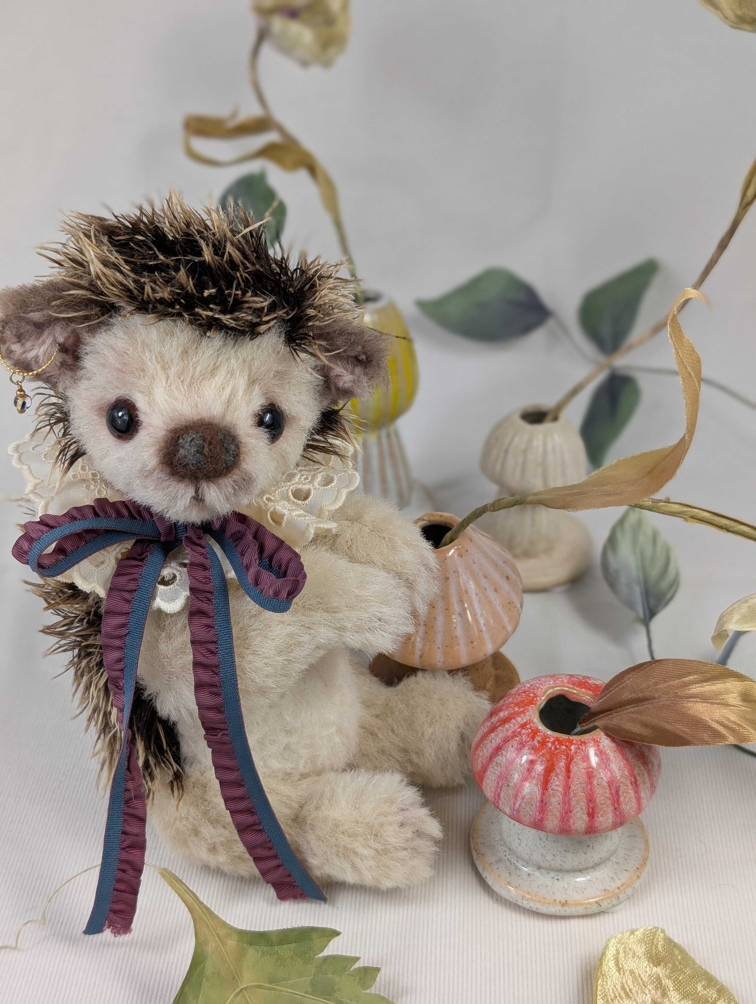ハリネズミのアーゴには、実は弟がいます。このお兄ちゃんアーゴは大阪でレッスンし、弟は東京での講習会に登場しました。今から7年近く前になります。大きいほうが初心者🔰さんには向いていると思うので、アーゴをレッスンすることに致しました。難しそうですが、意外にもお顔を作る位置が狭いので、初心者さん向きと北尾は思っています。お鼻は団子ッ鼻。羊毛フェルトを専用の針で植え込みます。失敗すると何度でもやり直しが手早くできる所も(めげやすい)初心者🔰さん向き。難しい縫製も済ませた半完成品ならでは(しかも手足には綿詰め済)の美味しいところだけをレッスンできるので、普段では習う時間が取れない(丁寧なコの字綴じ)や(特殊な目付の方法)など、手取り足取りスペシャルなテクニックを丁寧に習うことができます。こんな濃密な時間を初心者さんだけではもったいない!と思う方。ぜひ、ゆっくりと美味しい紅茶でも飲みながら個展会場でレッスンしませんか?3〜4時間での完成を目指します。ハリネズミのアーゴも只今、予約受付中です!「ハリネズミのアーゴ」2025年11/22(土)、11/23(日)個展会期中のレッスンです。33.000円 (半完成品キット含む)両日とも3名まで受付。お問い合わせ・予約受付:everynrose@yahoo.co.jp(北尾昌子)