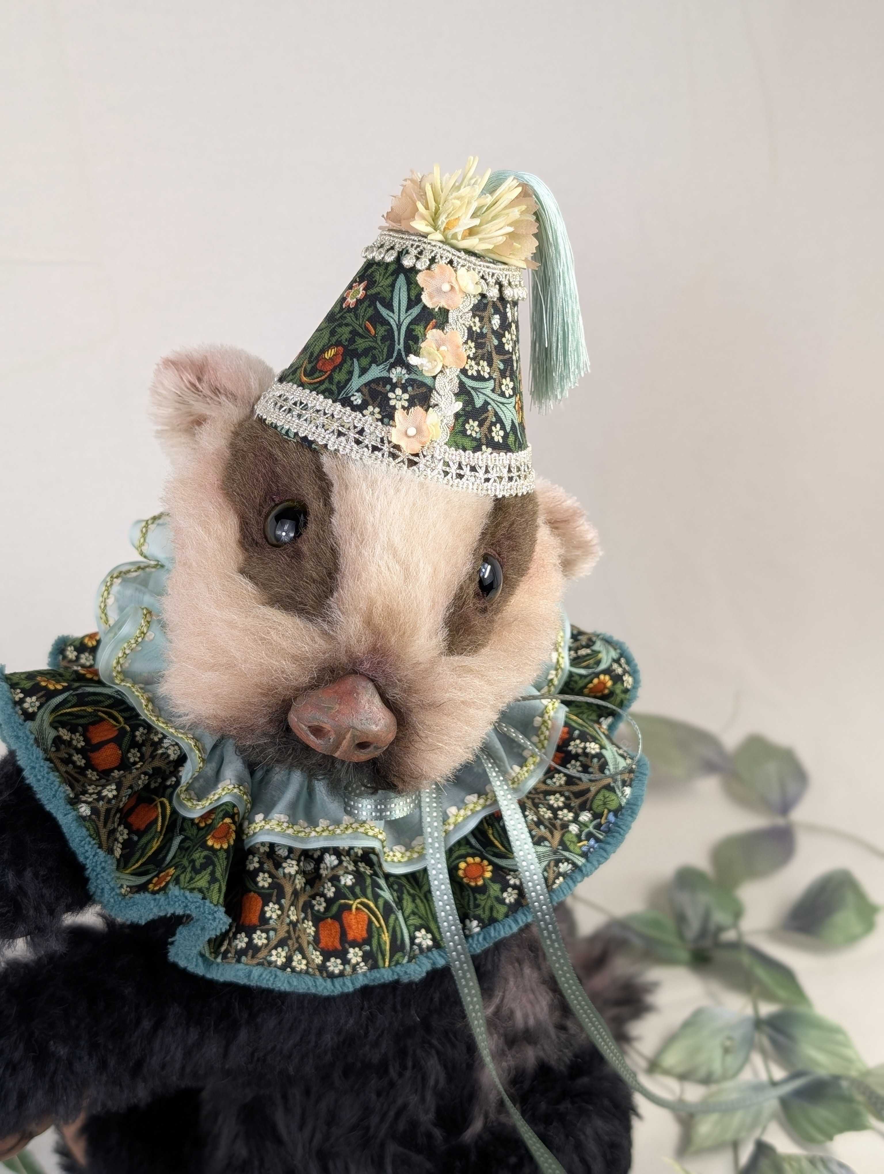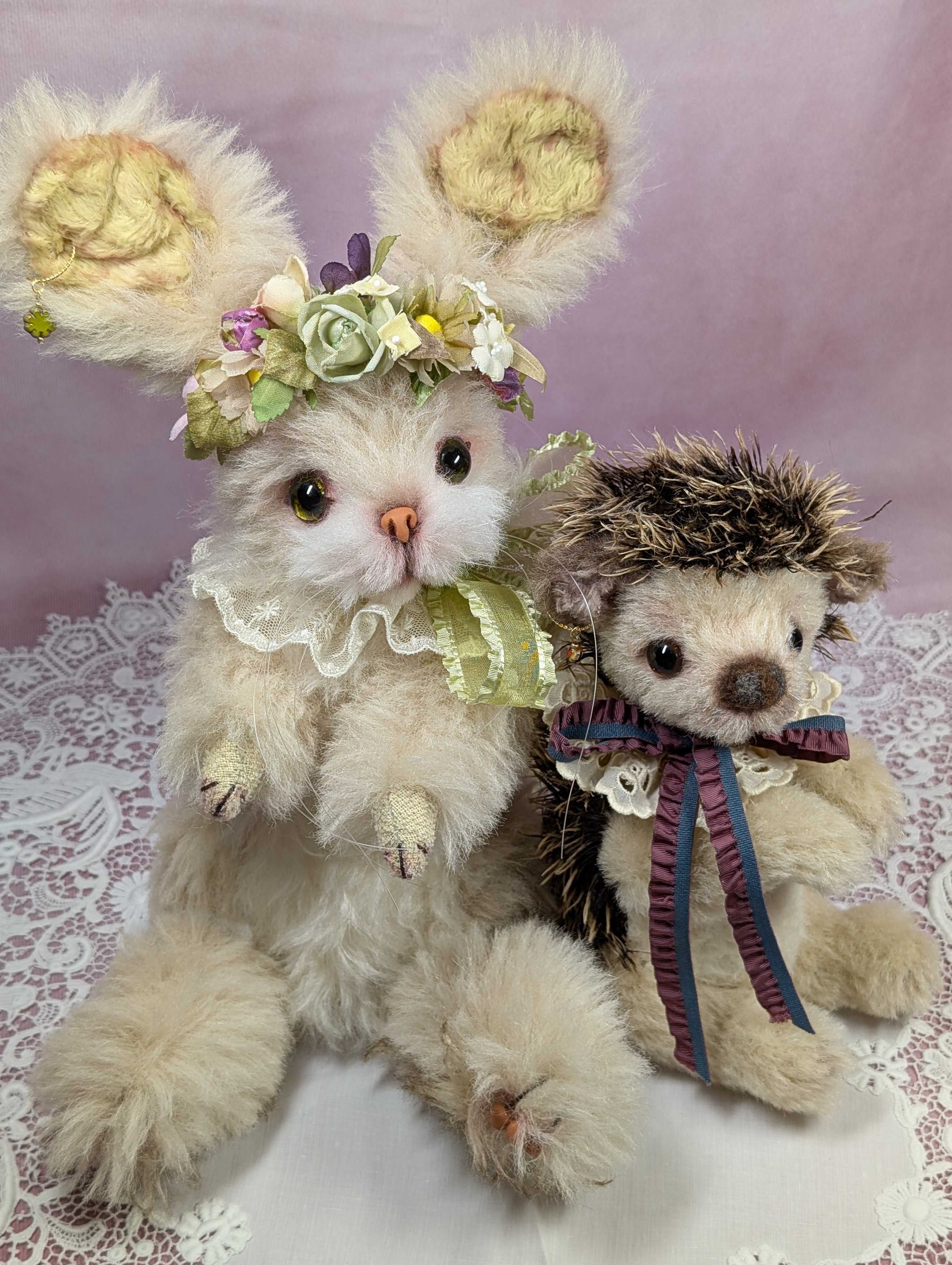 8,「黒ハリモグラ(カクタスタイプ)」25㎝ 88,000円(税込)ハリネズミ用モヘア(ブラウン×白)、チップドアルパカ、数種類のモヘア、樹脂粘土、オリジナルガラスアイ、アートフラワー(襟飾り・バラ)谷本恵美子作ハリモグラは久しぶりの登場。今回のテーマであり草木をテーマにした展示には、やはりこの子を出したい。こういう展示には欠かせない作品。憎めない仲間のハリモグラ。抱っこして背中の針を愛でたい欲望に駆られます。9,「黒ハリネズミ(セダムタイプ)」17㎝ 55,000円(税込)ハリネズミ用モヘア(ブラウン×白)、数種類のモヘア・アルパカ、数種類のモヘア、樹脂粘土、オリジナルガラスアイ、アートフラワー(草物で襟飾り)谷本恵美子作ハリネズミはいつも気弱そうな表情をしています。丸々とよく太った、二重顎の持ち主。お腹が可愛いとよく言われます。お腹を見たいと思われる方。是非会場でポンポコお腹を愛でてやってください。10,「白モモンガ(アンズタイプ)」14㎝ 55,000円(税込)ショートモヘア、アンティーライクビスコース(手染め)、オリジナルガラスアイ、ウルトラスエード、襟飾り(シルクリボンとアンティークタティンレース)、アマーチャー(尻尾)、銅線(耳、手足)、アートフラワー(草花の襟飾り)谷本惠美子作ここ数年作っているこのモモンガはお座りタイプ。リクエストのあった毛足の短いスムースタイプで制作。お尻尾だけは自由に動けるようアマーチャーを入れています。モモンガはこのビスコースで作るのが定着しましたね。とてもリアル感がありますが今回は可愛い女の子のイメージに。ショートモヘア、アンティーライクビスコース(手染め)、オリジナルガラスアイ、ウルトラスエー襟飾り(シルクリボンとアンティークタティンレース)、アマーチャー(尻尾11,「立ち耳・巻き毛ウサギ(ロッテ)」30㎝未完成(55,000円の予定)12,「立ち耳・細長ウサギ(ベラ)」40㎝ 未完成(55,000円の予定)13,「シマエナガ・大人(ラミウム)黒衣装」14㎝ 44,000円(税込)ショートモヘア、アンティーライクビスコース(手染め)、オリジナルガラスアイ、地巻きワイヤーと絹布(黒染め)、襟飾り(黒アンティークレース)、ミニ・クラウン帽子(手作り)着脱可能。この子は少し太めで大人のエナガちゃん。ヘッドにはブルーのクラウンを(着脱可能)。襟飾りはブラックコーデで大人のムードを出しています。NO,14「シマエナガ・ベビー (エーデルワイス)黒衣装」13㎝ 41,800円(税込)ショートモヘア、アンティーライクビスコース(手染め)、オリジナルガラスアイ、地巻きワイヤーと絹布(黒染め)、襟飾り(レース)、ミニ・クラウン帽子(手作り)着脱可能。(ベビーエナガ)はちょっとお顔に濃い色が入っているのが特徴。大人より少し小さめ。ボディーも濃い色が多めで、大人になりきっていないベビーならではの色合いをしています。今回は黒い装飾で大人のイメージに。白いマーガレットの小花が初々しさを醸し出しています。15,「小豆色ベア(ビーンズ)」41㎝ 110,000円(税込)チップドロングウェイビーモヘア(染)、オリジナルガラスアイ、フエルト(染)、アンティークレース、木馬リボンチップドのウェイビーモヘアを染めて、小豆色に。毛先の白っぽいところがエレガントに見えて女性的な印象を与えます。今回のベア達と比べると、かなり大きく見応えがあります。まん丸い顔つきと短め手足がカワイイ。手足には同染めのフエルトを使いました。今回、再登場の作品です。
