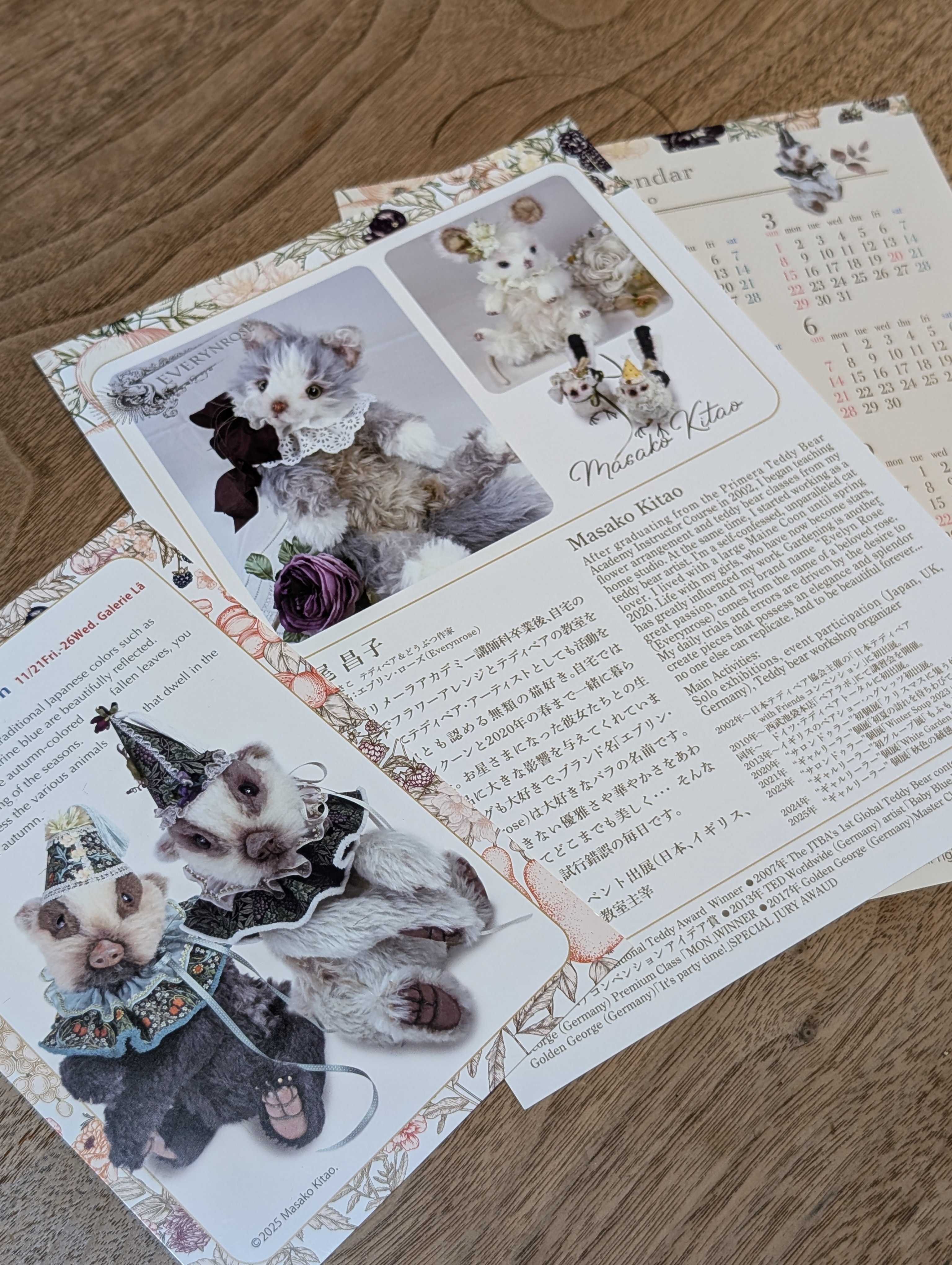 カレンダーが仕上がって来ました。個展時に来場してくださったお客様へのプレゼント。今年は自分の作家プロフィールを載せてもらいました。海外のお客様が多い奥野ビル。私自身も海外出展があるので、英語訳の文章も今年は入れてもらいました。表は作品の写真とプロフィール(英訳付)。裏は2026年版カレンダー。今年もまた来場の皆さんに差し上げます。招待状との相性もバッチリですね!作ってくれた友人のOさん。有難う!