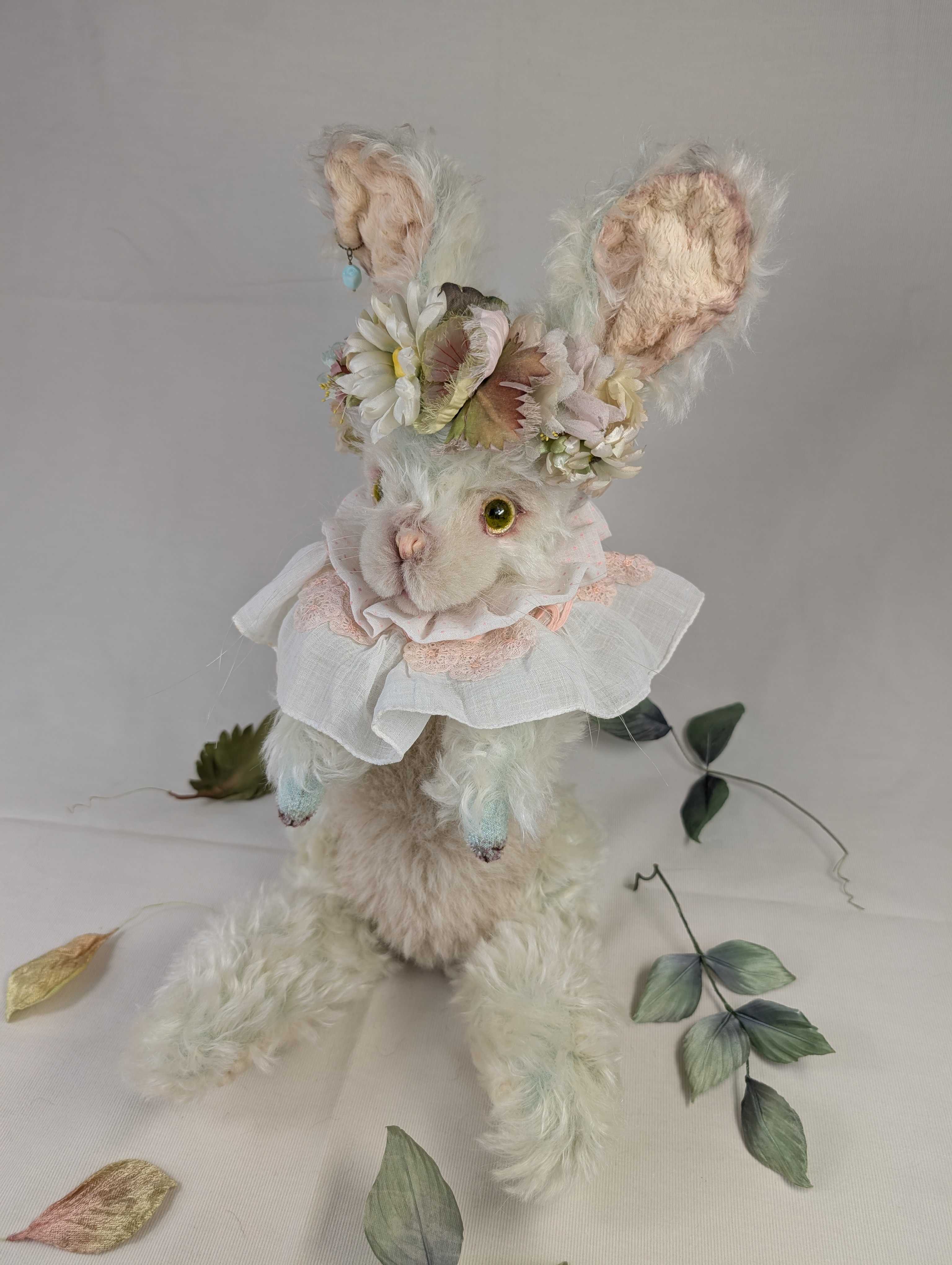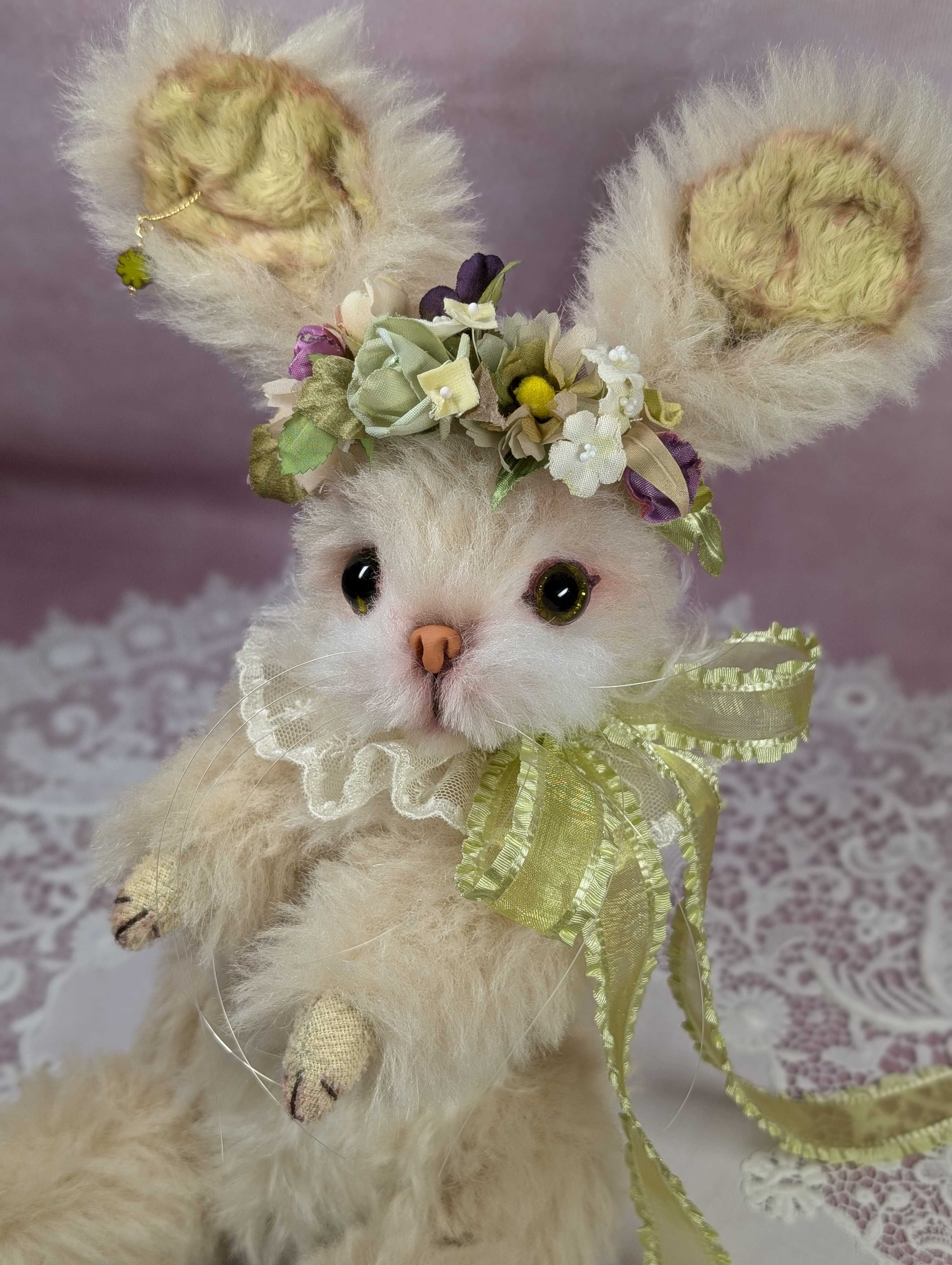 「京都テディベア博覧会ときどきアニマル」 2025年9月6日(土) 10:00〜11:00(プレビュー) 11:00〜17:00一般入場(入場は16:30まで) 会場:京都文化博物館 別館 販売作品は全部で8点。3点目のご紹介はお耳の長〜いグリーン色の目をしたウサギさん。