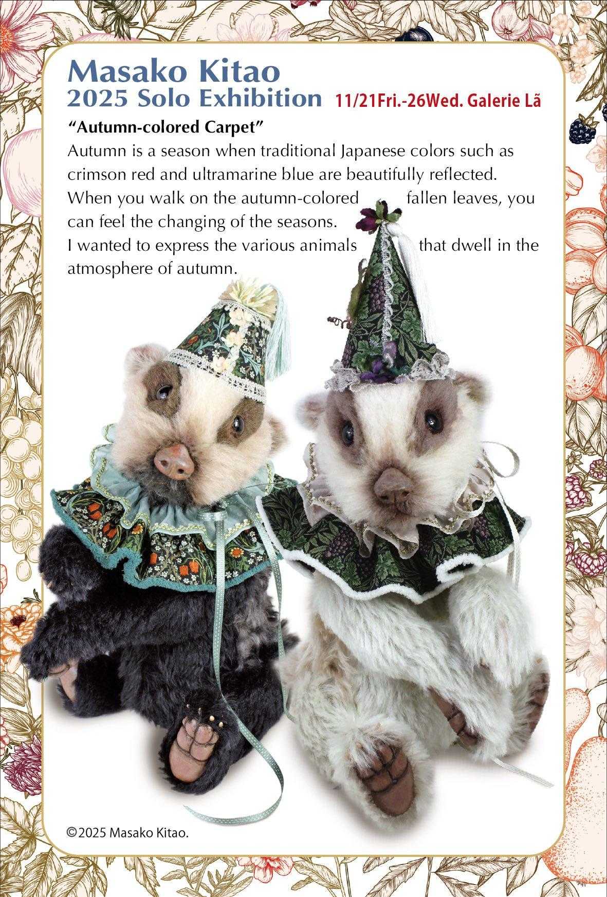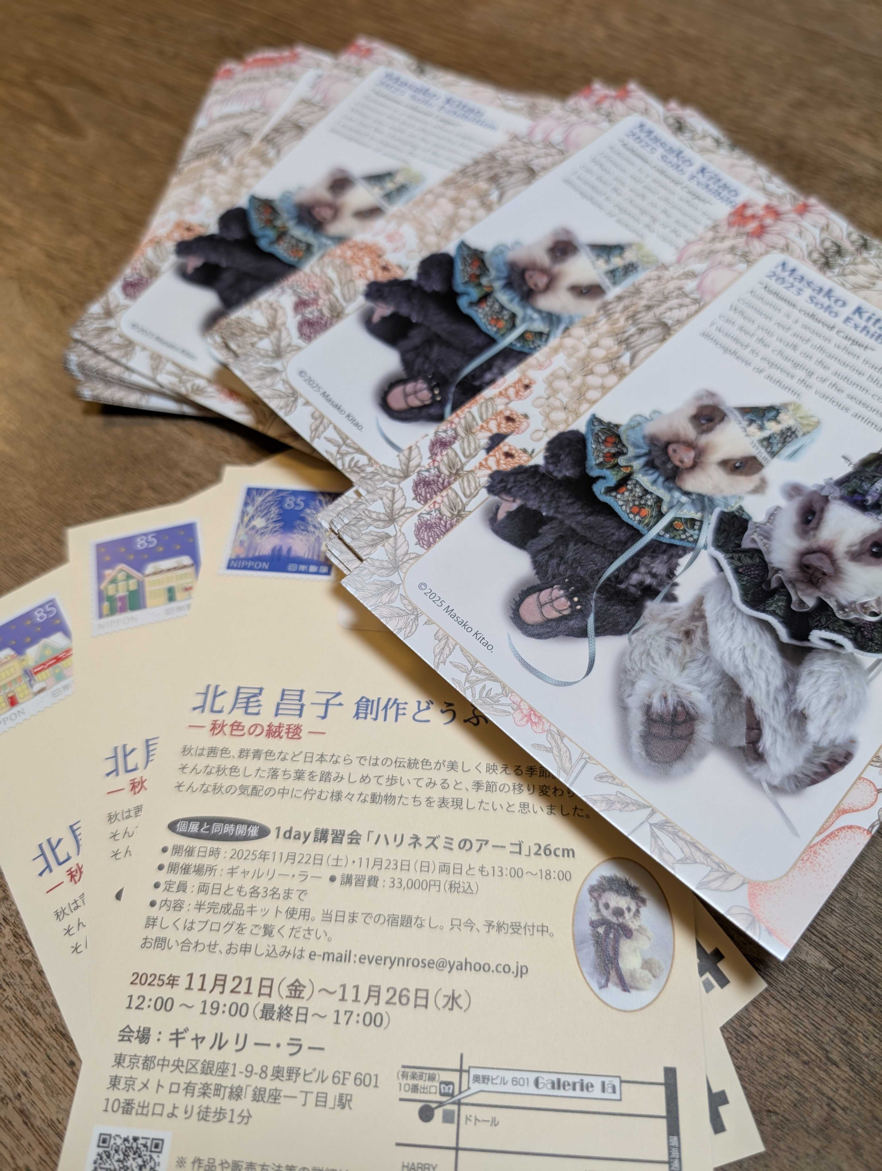 猛暑で辛かった夏がやっと終わったような今日このごろ。皆様いかがお過ごしでしょうか。あと、1ヶ月ちょっとで今年も銀座で個展を開催致します。今年のテーマは「秋色の絨毯」。秋の落ち葉に佇む動物達をイメージして展示をしたいと思っています。11月末初冬の銀座にお越しの際は、ぜひ会場へ足を運んで頂けたらと思います!北尾昌子 創作どうぶつ展〜秋色の絨毯〜秋は茜色、群青色など日本ならではの伝統色が美しく映える季節。そんな秋色した落ち葉を踏みしめて歩いてみると、季節の移り変わりを感じます。そんな秋の気配の中に佇む様々な動物たちを表現したいと思いました。2025年11月21日(金)〜11月26日(水)12:00〜19:00(最終日〜17:00)会場: ギャルリー・ラー東京都中央区銀座 1-9-8奥野ビル6階 601号1day講習会「ハリネズミのアーゴ」2025年11/22(土)、23日(日)定員: 両日共各3名まで。開催場所: ギャルリー・ラー講習費: 33,000円(税込)個展開催時に同じ会場で開催。※両日共、満席になりました!