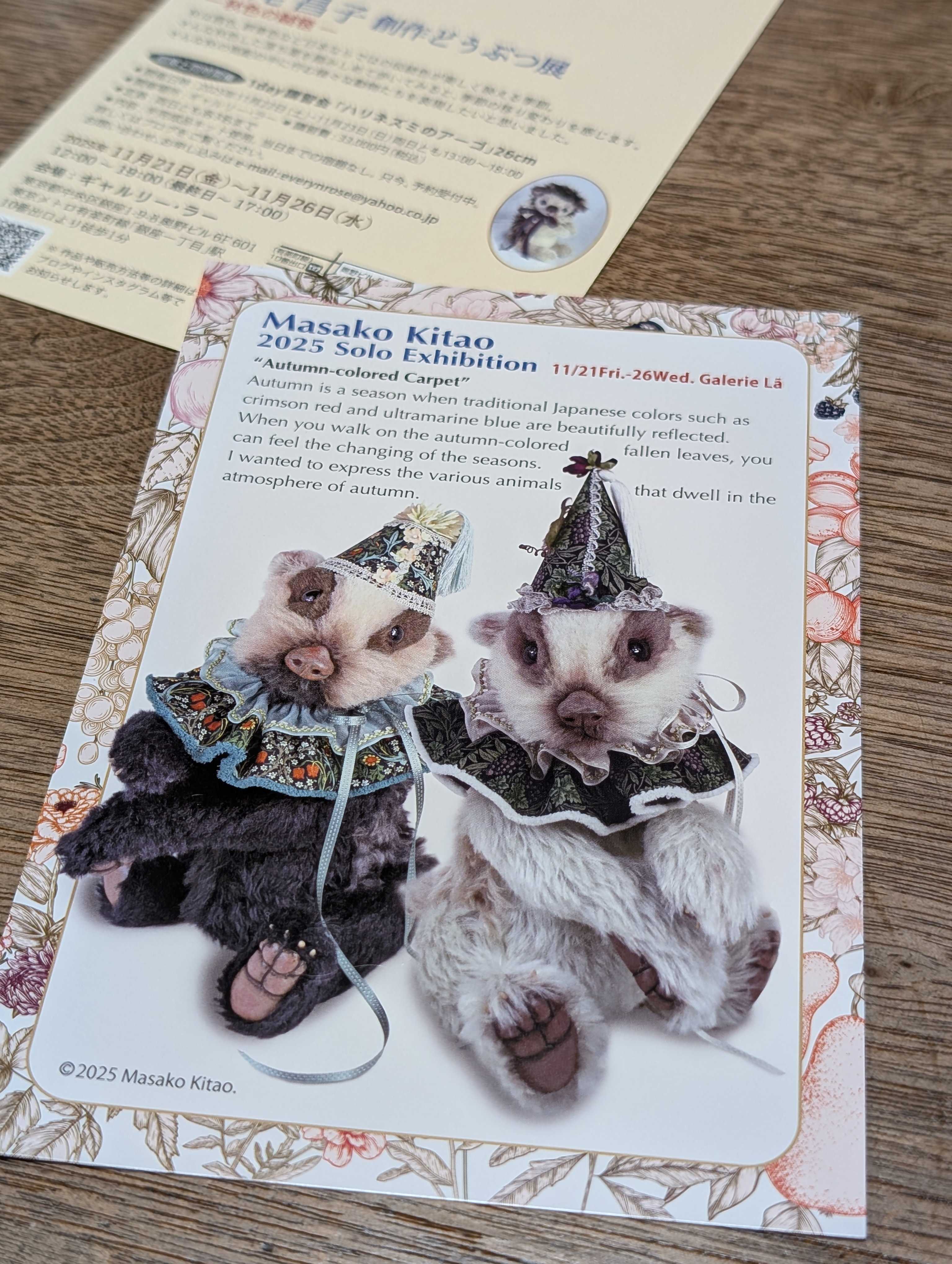 さあ!明後日、開催の「京都テディベア博覧会」に出展するため、明日搬入に京都へ旅立ちます。台風が来るとのことで、明日出発する作家さんはドキドキしていることでしょうが、私もその1人です。なんとかたどりつけると良いなぁと思っています。今回の京都は11月の個展前にお客様と直接お話ができる、唯一のイベントです。このショーに出展を決めたとき、宣伝も兼ねてのお披露目が出来たらと思っていました。いつも個展用招待状を作ってくれる友人が急いで京都に間に合うよう素敵なDMを作ってくれました。2025年11月の個展は秋のイメージ。詳しいタイトルや詳細はまた今度にして、先ずは京都で出来立てホヤホヤの招待状をみなさんにお持ちいただきたいと思います。京都では、販売はできないけれど個展用の見て頂く作品を持って行きたい。と、思っていました。でも、あまりの今年の暑さで、手にブツブツができる汗疱という症状が出てなかなか治らずで。涼しくなると自然に治ると皮膚科の先生に言われ、無理をしないでおこうということに。。個展作品、大きなメインクーンを作っていて、縫製まではできたのですが、完成はまた、京都が終わってからになります。先ずは明日、無事に京都へたどり着けますように!そして翌日の初日を予定通り迎えることができるよう祈っています。