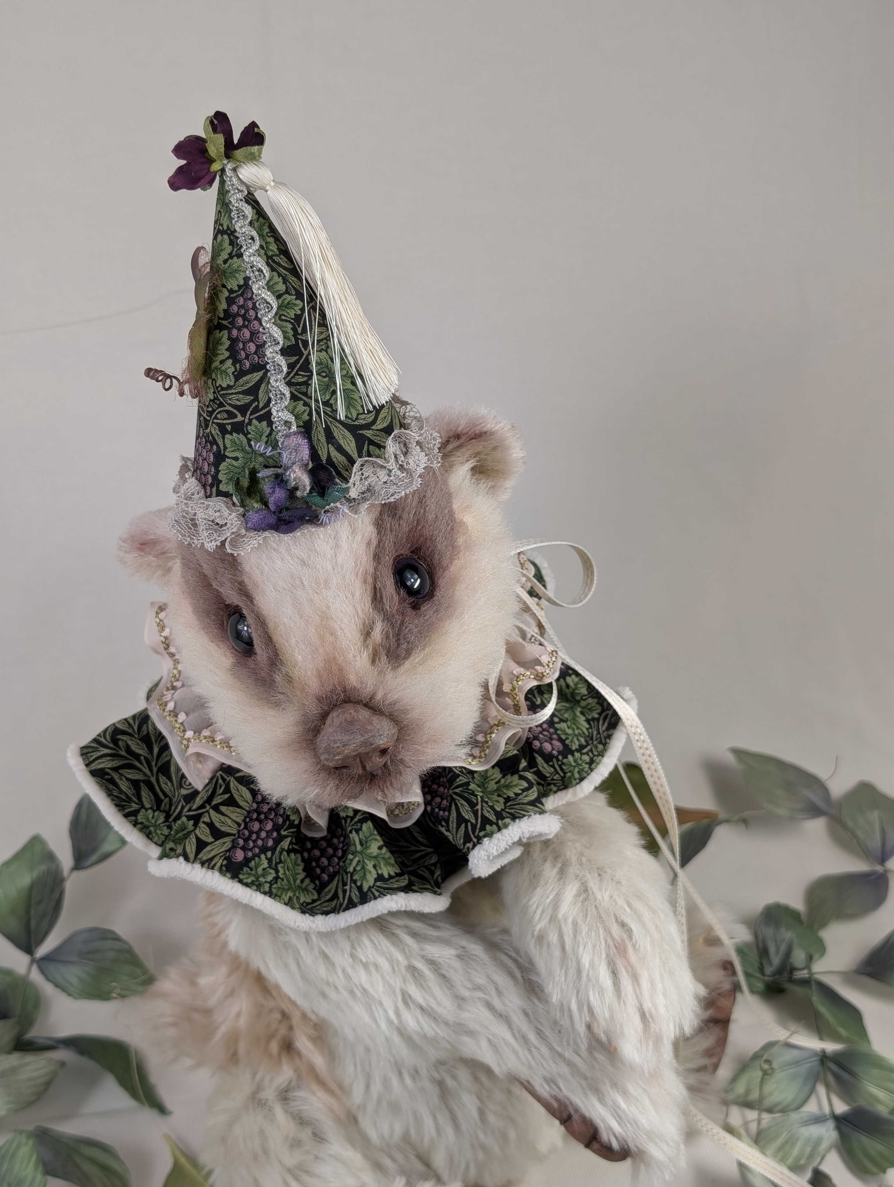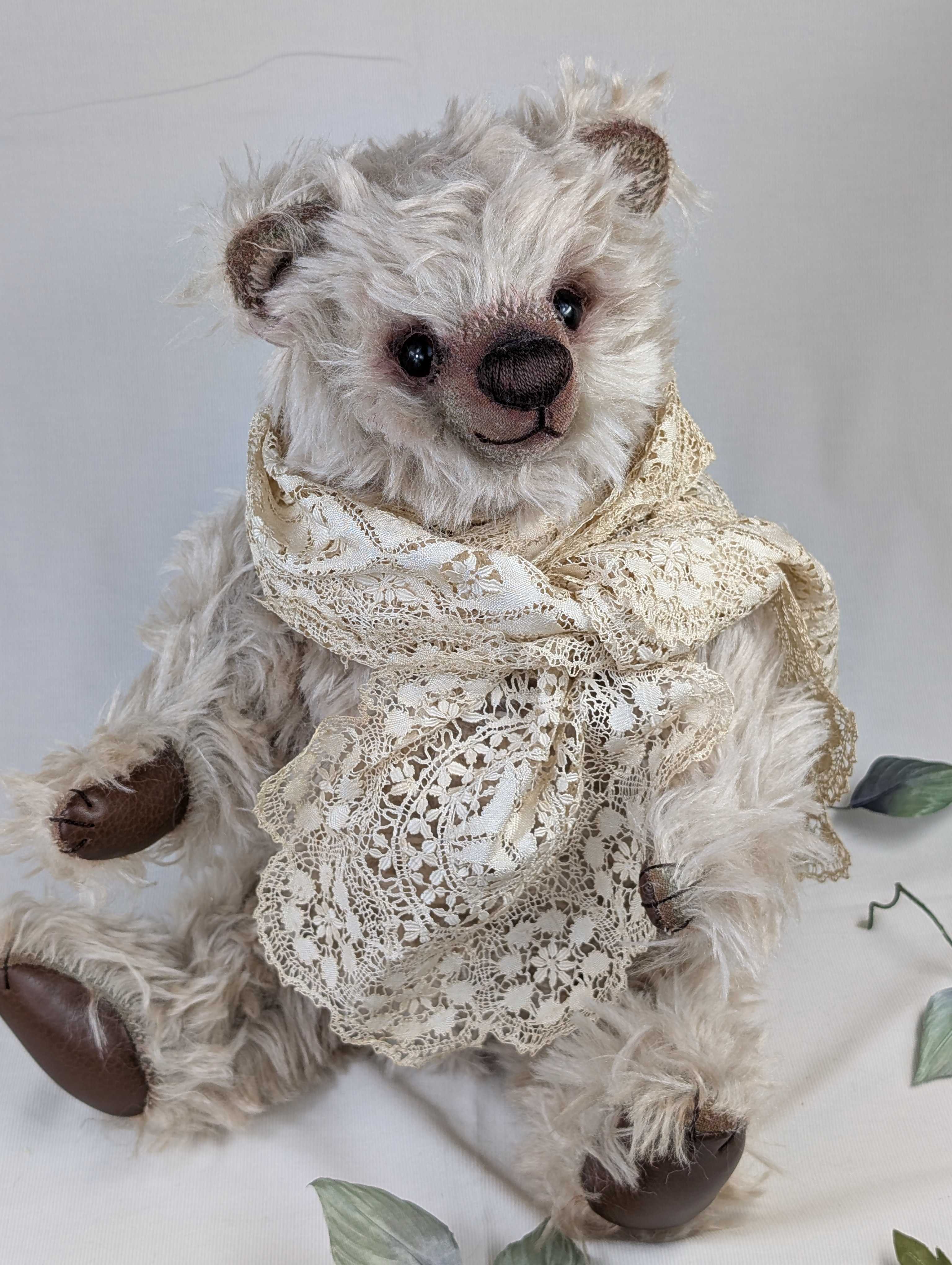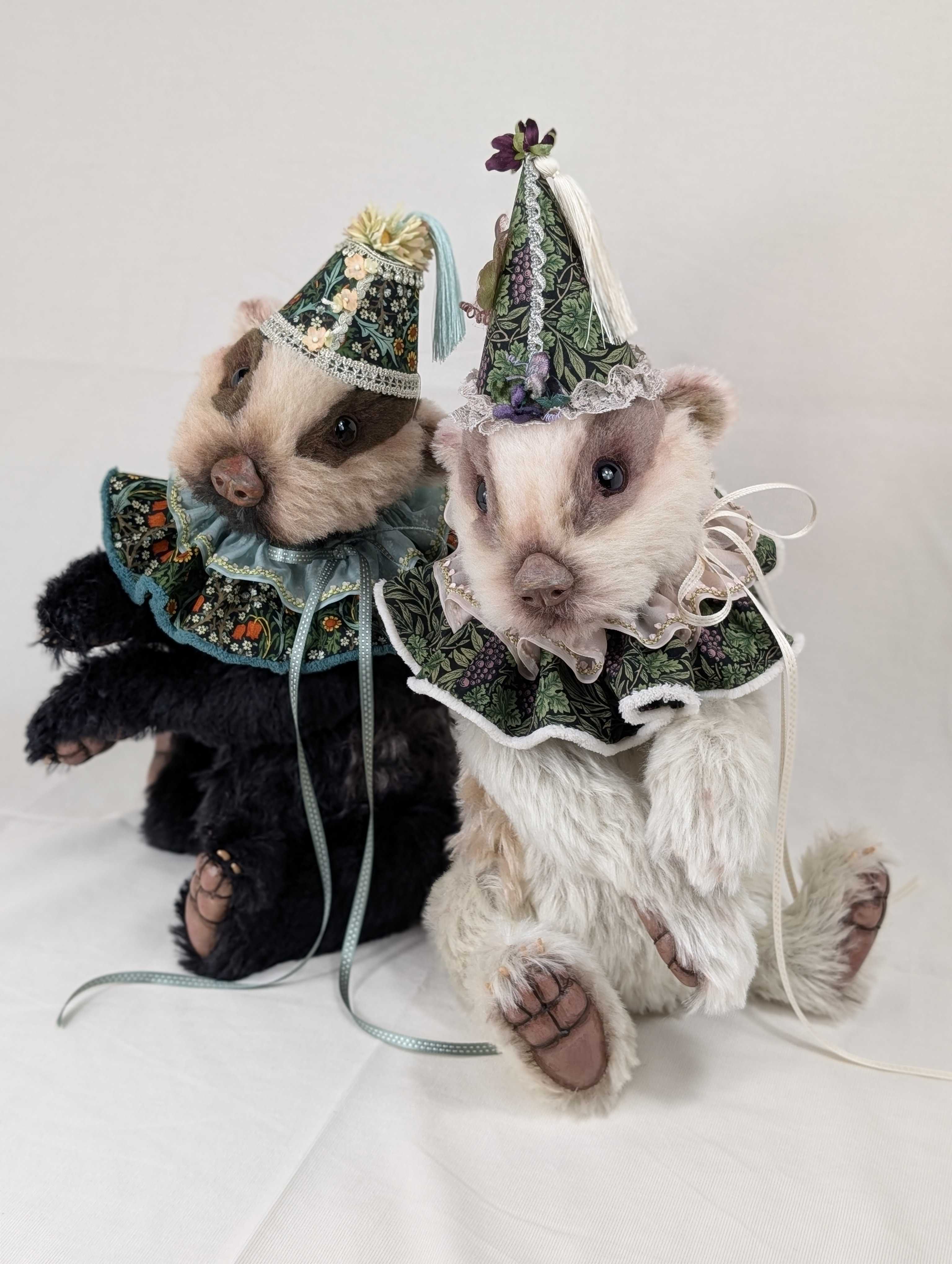 1,「焦げ茶ベア(マイロ)」37㎝ 99,000円(税込)カーリーモヘア(手染めブラウン2色)、オリジナルガラスアイ、染めフエルト、刺繍糸(鼻)、襟飾り(ドイツのアンティーク手縫いコットンレース)まん丸いお顔と愛嬌のある表情。長い手足。一見、クラッシックなんだけれど、憎めないまあるいボディの持ち主。柔らかくゴージャスで上質な手触り。毛量の多い少し長めのモヘアを染めたら、こんな作品を作りたくなりました。ベアは材料の様子で、違って見えることがあります。微妙に色が異なる手染めの2色のブラウンを組合わせてベアを作りました。赤いお目々がチャームポイント。ラズベリー色したフエルトがベア・マイロの差し色になっています。 2,「ベージュベア(ルナ)」30㎝ 88,000円(税込)カーリーモヘア(手染めベージュ)、オリジナルガラスアイ、染めフエルト、刺繍糸(鼻)、襟飾り(アンティークシルク&木馬ドットリボン)今年のベアは何だかみんな材料に心を動かされている気がします。手触りや光沢。ズッシリとした密度あるモヘア。元々、材質に惚れ込んでコレクションに貯め込む傾向があるのですが、このベアもそういう感じで手に入れたモヘアで作りたい衝動に駆られました。手足の短い幼児体型で胴長のベア。ちょっぴりさみしそうで甘えん坊。このモヘアでそんなベアを作ってみたい。そんな思いで、このルナは誕生しました。2025年の個展では、この北尾オリジナルベア「ルナ」の型紙で数名の生徒さん達が思い思いの材料で作品を作ったベアを展示したいと思います。会場の一角のスペースに飾った5名の生徒さん達が作った7体の(ルナの子どもたち)を是非ご覧ください。 3,「チョコレートパンダ(ダンダン)」30㎝ 99,000円(税込)アルパカ(焦げ茶・白)、オリジナルガラスアイ、本革(肉球)、樹脂粘土(鼻)リアルなタイプのパンダを作るのは初めてです。少し短毛で黒に近い焦げ茶色のアルパカと、アイボリーですが少しくすんで野性的なムードのアルパカを見つけました。この2つの材料を触っていると、こういう感じのパンダを作りたくて。手の平もリアルに作り込んでいます。他の獣ではこういう手の込んだ手足の平を作るのですが、ベアやパンダでは初めて。今回、お鼻もリアルさを増すために樹脂粘土を使用。初めての試みでも、作り慣れた材料を使うと意外にもしっくりきました。皆さん、リアルパンダのダンダンに会いに来てくださいね! 4「大ネコ・メインクーン(カシュータイプ)」60㎝110,000円(税込)ロングモヘア(グレー)、アルパカ&ウエイビーモヘア数種、スエード(肉球)オリジナルネコ目ガラスアイ(イエロー)、スエード(肉球)、ハート形クッション2個(手作り)、モクバリボン、アンティークコットンレースの襟飾り、カゴ、アンティークレース敷布、アートフラワーのバラ(谷本恵美子作)このカシューが初登場したのは前々回の個展でした。ずっとリクエストがありましたが、やっと再登場。ペチャンコお顔が最近多かったから、久しぶりのメインクーンですね。ロングのモヘアも手に入りにくくなりました。こういう材料がまだ手元にあるうちに作っておかないとと思いまして。口元を今回はあまりカットをせずに、ふんわりとした感じに仕上げました。 5,「大ネコ・ミヌエット(フリーダ)」47㎝ 132,000円(税込)ロングモヘアとアルパカ(白・チップド焦げ茶)、海外作家作ガラスアイ(ブルー系)、肉球(スエード)、アンティークベルベット&タッセルの襟飾り、アートフラワーへッド飾り&バラの花(谷本惠美子作)昨年もこの大きなミヌエットを作りました。とても人気があり、今年もタイプを変えて制作。昨年は女性らしいネコちゃんでしたが、今年は何だかボーイッシュ。いたずらっ子な目の色と表情がとても可愛らしいです。パリの手芸屋さんで今年2月に購入したベルベットの幅広リボンとはアンティークタッセルで襟飾りを作ってやりました。華やかな装いなのに、お顔が男の子。このギャップが面白い!大きなミヌエットのフリーダに、是非会いに来てやってください。 6,「白アナグマ(ナラ)」39~51㎝ 110,000円(税込)数種類のモヘア、アルパカ、オリジナルガラスアイ、肉球(革)、クラウン帽子(ウイリアムモリス柄)手作り、 木馬リボン・レース、タッセル、アンティークベルベットリボン・ビーズ。今年の招待状になっている、アナグマツインズの1体です。今年で3年連続登場のアナグマ。毎年少しずつ手を入れて型紙共に変えていき、今年とうとう白黒ペアで作ってみました。2体が並ぶとインパクト抜群です! 7,「黒アナグマ(バルー)」39~47㎝ 110,000円(税込)数種類のモヘア、アルパカ、オリジナルガラスアイ、肉球(革)、変形クラウン帽子(ウイリアムモリス柄)手作り、 木馬リボン・レース、タッセル、アンティークベルベットリボン・ビーズ。今年の招待状になっている、アナグマツインズのもう1体です。黒い子の方がお顔の雰囲気がよくわかります。白い方がお姉さん。黒い方が何だか弟に見えるのは私だけで