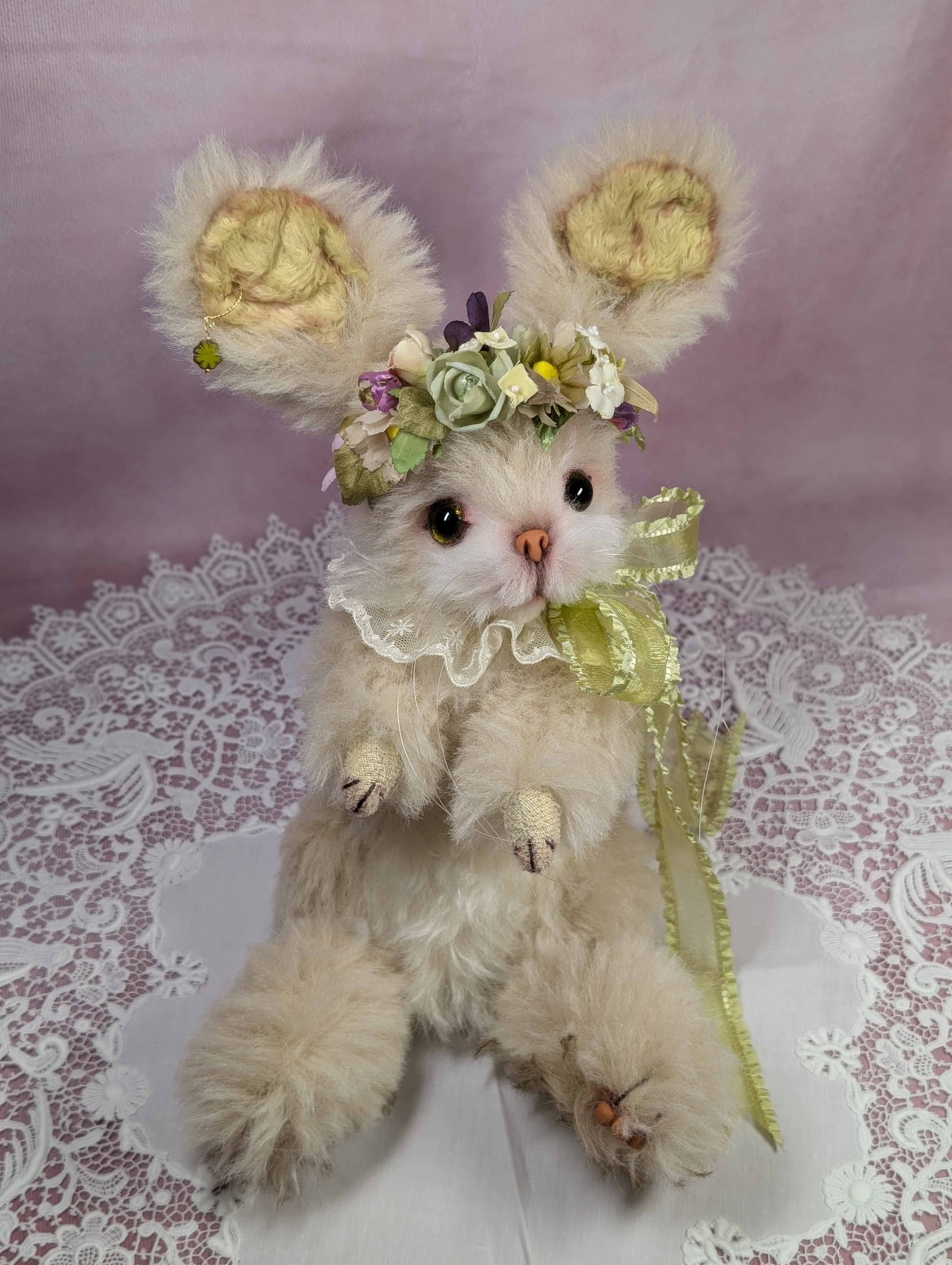 1day 講習会「ウサギのパセリ」2026年1/31(土) 10:00〜17:30 (途中休憩時間含む) 47,300円(半完成キット含む) 只今予約受付中。 お問い合わせとご予約先: everynrose@yahoo.co.jp(北尾昌子)この耳立ちウサギさんは、私の作品の中でも古くから人気で実はよく作るタイプです。お客様から「いつかこの子をレッスンしてください!」と熱〜くお願いされていまして。。でも1dayで仕上げるには、私が普段制作している型紙では、たくさんの体数を作ることができませんし、顔や耳を上手に仕上げるようにレッスンしてあげられるか自信がありませんでした。それで、生徒さん達が作りやすいように型紙を作り直し今回のパセリを誕生させました。いつもの販売用型紙だとパーツが多いので、メリハリが効いた結構険しいお顔になりますが、少し耳や目の周りや首周りを変えたことでフンワリとした柔らかい表情に仕上がります。それでも、私の悪いクセで上質のアルパカやモヘアの材料に8種類を使用。アルパカも2cm以上のロングタイプを使い、モヘアも3cm以上の毛足が長いタイプが好きなものですから、やはり材料費が嵩みまして。。昨年のミヌエットのクルトンと同料金になってしまいました。今回使った薄緑色のアルパカがこのレッスン用と、もう1体分でどうも終了になり今の段階では手に入りません。ぜひ、この1機会にこのフワフワした上質なアルパカの手触りを楽しんでいただけたらと思います。このパセリでは、お耳を自由に形作るレッスンと、とりつけかた、お鼻や他のパーツを粘土で焼いたりと、また、盛り沢山な内容になりそうです。それでも、昨年のミヌエットのクルトンよりは少し楽かな??ヘッドドレスのカチューシャのお花はいつもお花を作ってくれる広島の母にグリーンをメインにとお願いして作ってもらいました。沢山のお花の種類を使用したものですから、皆さんが作る場合難しいのではと思い、実は私が全ての生徒さん用カチューシャを仕上げています。当日は、お好きなカチューシャを選んでいだだきますね。本日9/1〜予約を開始いたしました。是非、ご参加をお待ちしています!1day 講習会「ウサギのパセリ」2026年1/31(土) 10:00〜17:30 (途中休憩時間含む) 47,300円(半完成キット含む) 只今予約受付中。 お問い合わせとご予約先: everynrose@yahoo.co.jp(北尾昌子)