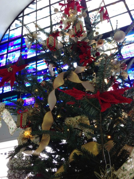 ホテルエクセル岡山の斜向かいにある岡山シンフォニービルのロビーにクリスマスツリーが設置されていました。金銀のオーナメントやリボン、ポインセチアの赤が枝葉に映えるゴージャスなツリーです。青い輝きを放つステンドグラスにクリスマスツリー。なんとも絵になる組み合わせですね♪