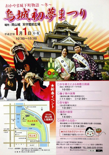 1月1日より、岡山城天守閣前広場で「烏城初夢まつり」が開催されます。少年剣士による剣道の初稽古や獅子舞の演舞などのステージ、こま回しや福笑いが楽しめるお正月あそびのコーナーなど、お正月気分が盛り上がる新春イベントが用意されています。また、当日は岡山城城主・宇喜多秀家とその妻・豪姫によるお餅つきもあり、つきたてのお餅がその場でふるまわれます。ほんのり温かく柔らかい杵つき餅の味は格別ですよ。なお、1月1日は岡山城・岡山後楽園・岡山県立博物館が入館・入園無料となります。烏城初夢まつりの催し物のあとは、天守閣から景色を眺めてひと息、岡山後楽園で散策ののち、岡山県立博物館で貴重な収蔵物を鑑賞……。お正月早々、こんな贅沢な観光コースが、なんと無料で楽しめます。ご家族そろって、ぜひお出かけくださいませ。≪スケジュール≫◎少年剣士による初稽古披露 10:00◎獅子舞の演舞 (1)11:00 (2)12:30◎豊年踊り 13:30◎篠笛の演奏 14:00◎お餅のふるまい (1)12:00 (2)14:30- - - - - - - - - - - - - - - - - - - - - - - - - おかやま城下町物語 ~冬~「烏城初夢まつり」日時/2015年1月1日(木・祝) 10:00~15:00場所/岡山市北区丸の内2-3-1 岡山城天守閣前広場アクセス/ホテルエクセル岡山より徒歩約8分 徒歩:JR岡山駅より徒歩約23分 路面電車:東山線「城下(しろした)」下車、徒歩約10分お問い合わせ先/086-225-2096(岡山城事務所)- - - - - - - - - - - - - - - - - - - - - - - - -