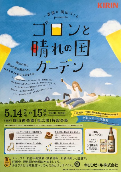ビール好きの皆さん、ご注目! 大名庭園で味わう特別な昼酒を愉しんでみませんか?5月14日(土)・15日(日)の二日間、岡山後楽園 東広場にて、キリンビール「岡山づくり」が楽しめるイベントがおこなわれます。「岡山づくり」は、岡山の酒米・雄町米で仕込んだ地域限定のビール。そのビールが、イベント当日の岡山後楽園入園券を提示すると、最初の1杯がなんと無料で提供されます!会場には岡山県産のゴザが敷かれ、ゆったり座れるデッキチェアも設置。ゴロンと体を預けて青空を見上げながら、冷えたビールをごくりとひと口。ピクニックのような開放感の中で味わうビールは、格別なものに違いありません。^^当日は、キリンビール岡山工場でのみ試飲できる「一番搾り 岡山づくり〈樽生〉」を、備前焼のタンブラーで味わうことができます。また、飲食テントにはビールのお供にちょうど良い岡山の旬の味わいが並び、乾杯を盛り上げる楽しいイベントも予定されているそう。気持ちの良い乾杯のひとときを、ぜひ皆さんでどうぞ♪- - - - - - - - - - - - - - - - - - - - - - - -○ゴロンと晴れの国ガーデン(当日の入園券提示で最初のビール1杯が無料)日時/2016年5月14日(土)・15日(日) 10:00~18:00(雨天の場合は5月21日(土)・22日(日)に順延)会場/岡山後楽園「東広場」特設会場料金/入場無料 ※別途、岡山後楽園入園料が必要です。(一般(15歳以上)400円、小・中学生・65歳以上 140円)お問い合わせ/TEL.086-224-7191(キリンビールマーケティング株式会社岡山支社)アクセス/ホテルエクセル岡山から徒歩で約12分JR岡山駅から路面電車「岡山駅前」電停より「東山行き」で「城下(しろした)」電停下車、徒歩で約13分またはJR岡山駅からバスで約15分「後楽園前」下車すぐ- - - - - - - - - - - - - - - - - - - - - - - -当店人気No.2★備前焼★レビュー割対象商品和食器、父の日ギフト、内祝い、お祝い、引き出物、贈答品などに【備前焼/和食器/窯元/酒器】 小西陶古 | ペアビアマグセット | ビアタンブラー/ビールグラス/ビアグラス/ビール【楽ギフ_包装】【楽ギフ_のし宛書】
