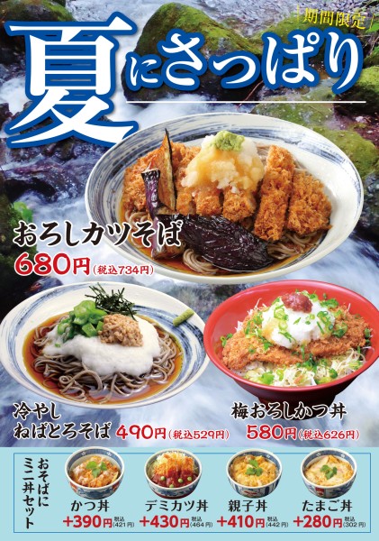 梅雨真っただ中。すっきりとしないお天気が続きますね。蒸し暑い今こそお肉を食べてスタミナをつけたいところですが、反して食欲は落ちてしまいがち…。そこで、爽やかなトッピングや冷たいおそばを組み合わせて食べやすく仕上げた夏メニューをご用意しました! さっぱり味のかつ丼、冷たいおそば、トンカツと冷たいおそば、の3種類。お好みに合わせてお選びください!○おろしカツそば 680円(税別)冷たいおそばに揚げたてのトンカツと揚げナス、その上に大根おろしをトッピング。ひんやり&熱々の組み合わせが美味しい~!○冷やしねばとろそば 490円(税別)とろろ芋・オクラ・納豆のねばねばコンビがた~っぷり! 美容や健康に良いとされるねばねば食材を冷たいおそばでさらりとどうぞ。○梅おろしかつ丼 580円(税別)カリッと揚がったトンカツを、大根おろしとたたき梅で味わう夏の味わい。パラリと散らしたネギの香りも食欲をそそります!※メニュー画像は津島店のものです。夏メニューはアリオ倉敷店でもお召し上がりいただけます。- - - - - - - - - - - - - - - - - - - - - - - -かつ丼城下町 津島店所在地/岡山市北区伊島北町25-1営業時間/11:00~22:00(LO 21:30)定休日/なし 駐車場/共用80台お問い合わせ/TEL.086-250-2900かつ丼城下町 アリオ倉敷店所在地/倉敷市寿町12-2 アリオ倉敷2階営業時間/9:00~21:00(LO 21:00)定休日/アリオ倉敷に順ずる駐車場/アリオ倉敷駐車場利用お問い合わせ/TEL.086-434-1300- - - - - - - - - - - - - - - - - - - - - - - -オハヨー乳業 冷(ひえ)みかん 21個入×8箱